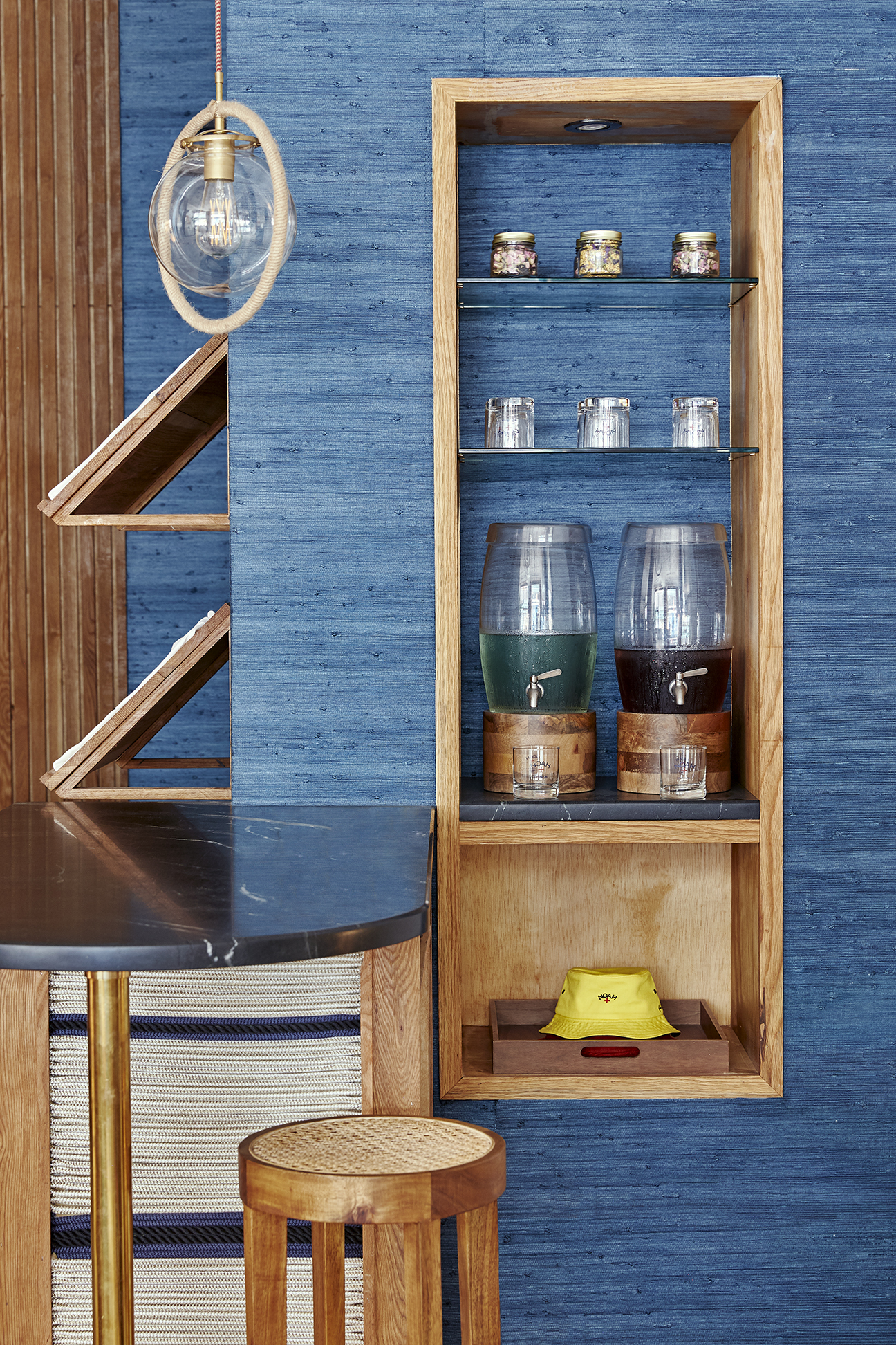 Stretched cotton rope adds texture to the tea bar area, along with grasscloth wallpaper (the ideal surface for pinning up inspiration—no visible marks!).