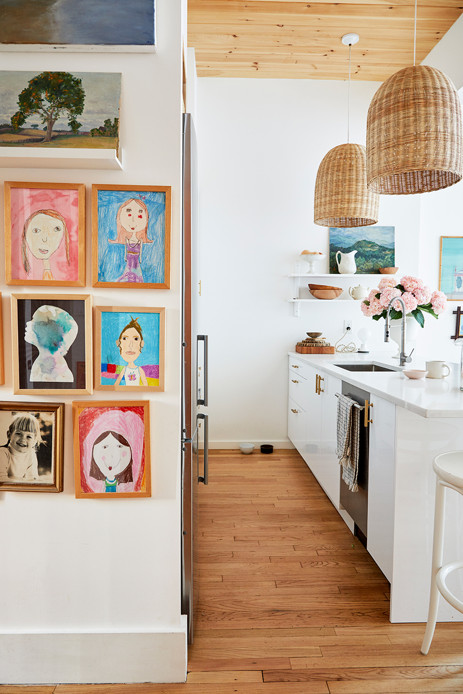 An avid collector of vintage folk art picture frames, Waterfield has a couple of eBay searches saved, so she gets notifications when people list them. Her most treasured works of art, however, are those created by her kids. Every year Emmy and Bodhi make a self-portrait, which she displays prominently in the main hallway. “I love how their perception of themselves morphs over time. Like, my daughter suddenly has eyelashes now,” she says, laughing. “I wanted to display all of them together because they tell a story.”
