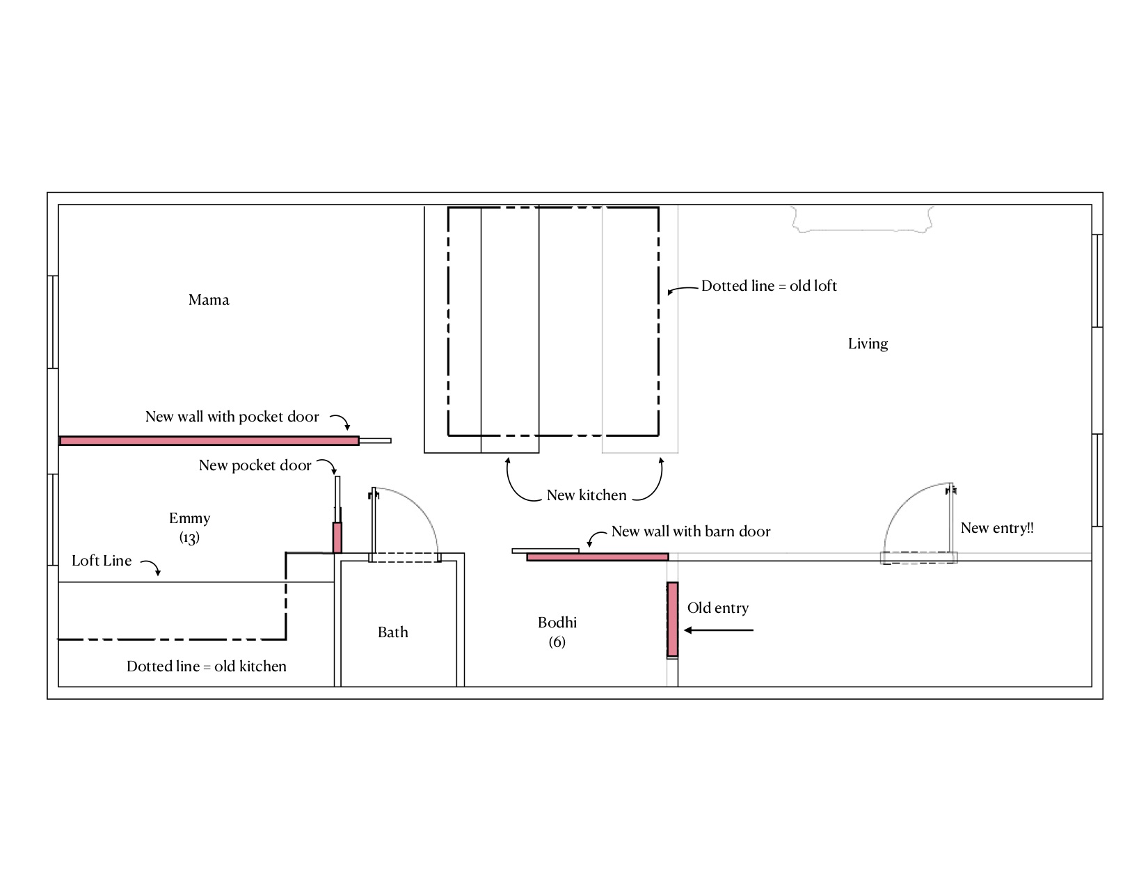 Turning a studio into a three-bedroom is a brain-racking endeavor, so Waterfield started with a basic sketch (see the old floor plan outlined in black and the new layout in red, below). Step one: Move the front door and turn the foyer into Bodhi’s room. Next up, tear down the old lofted bed that was at the center of the room and put the kitchen there, so Waterfield and her daughter could have their own spaces toward the back of the building, where it’s quieter. Two walls, two pocket doors, and one barn door later, and—boom!—a perfectly functional (and fun) family home. “In New York City, you need to figure out how to use every square inch more efficiently,” says Waterfield.