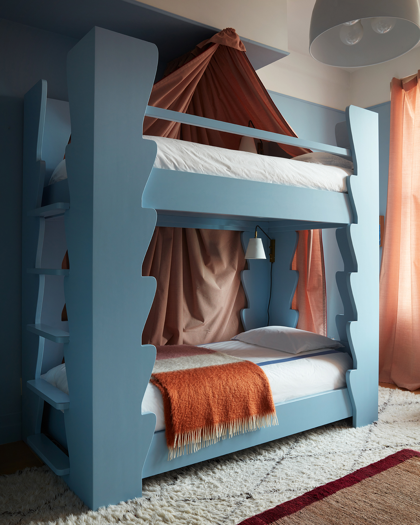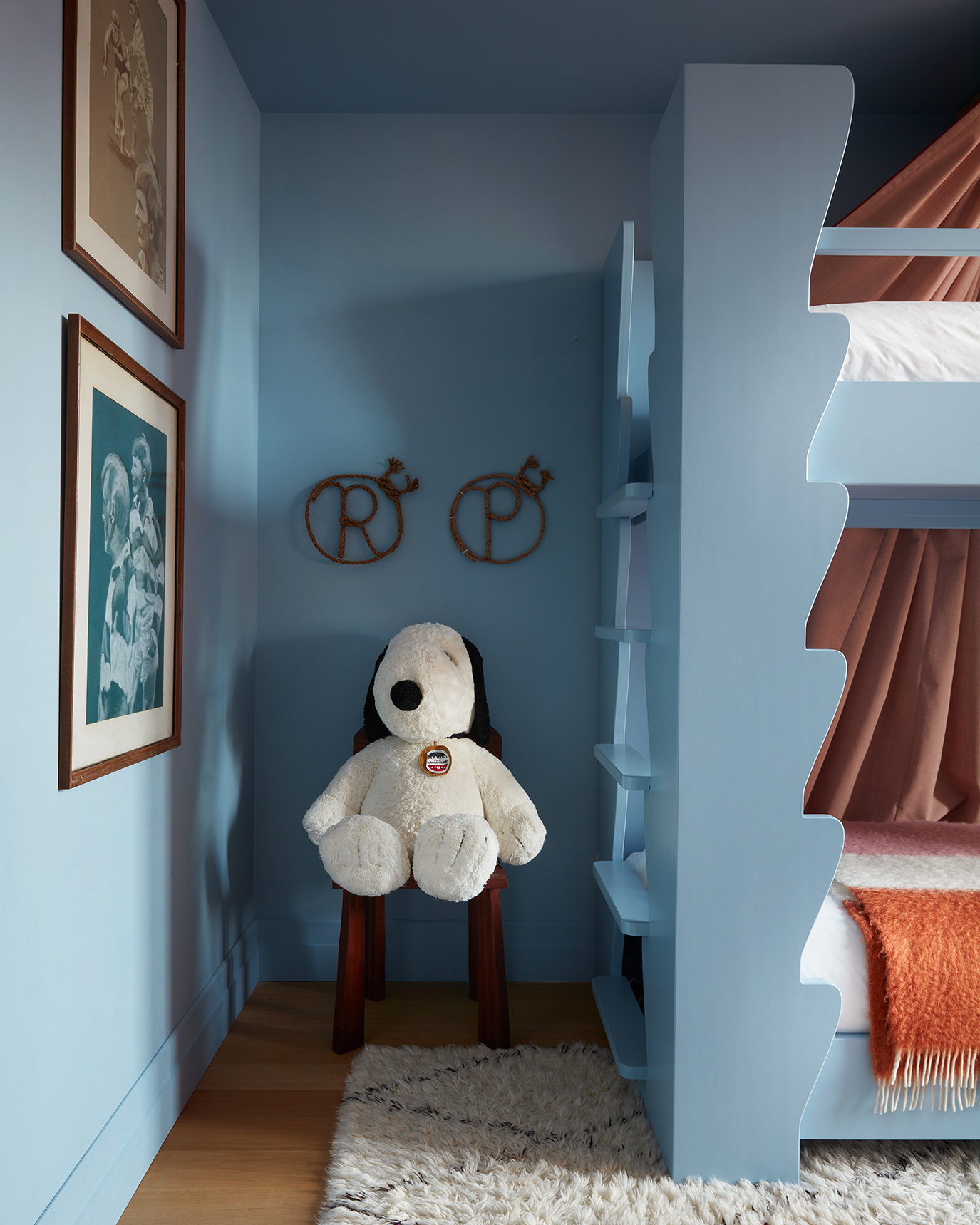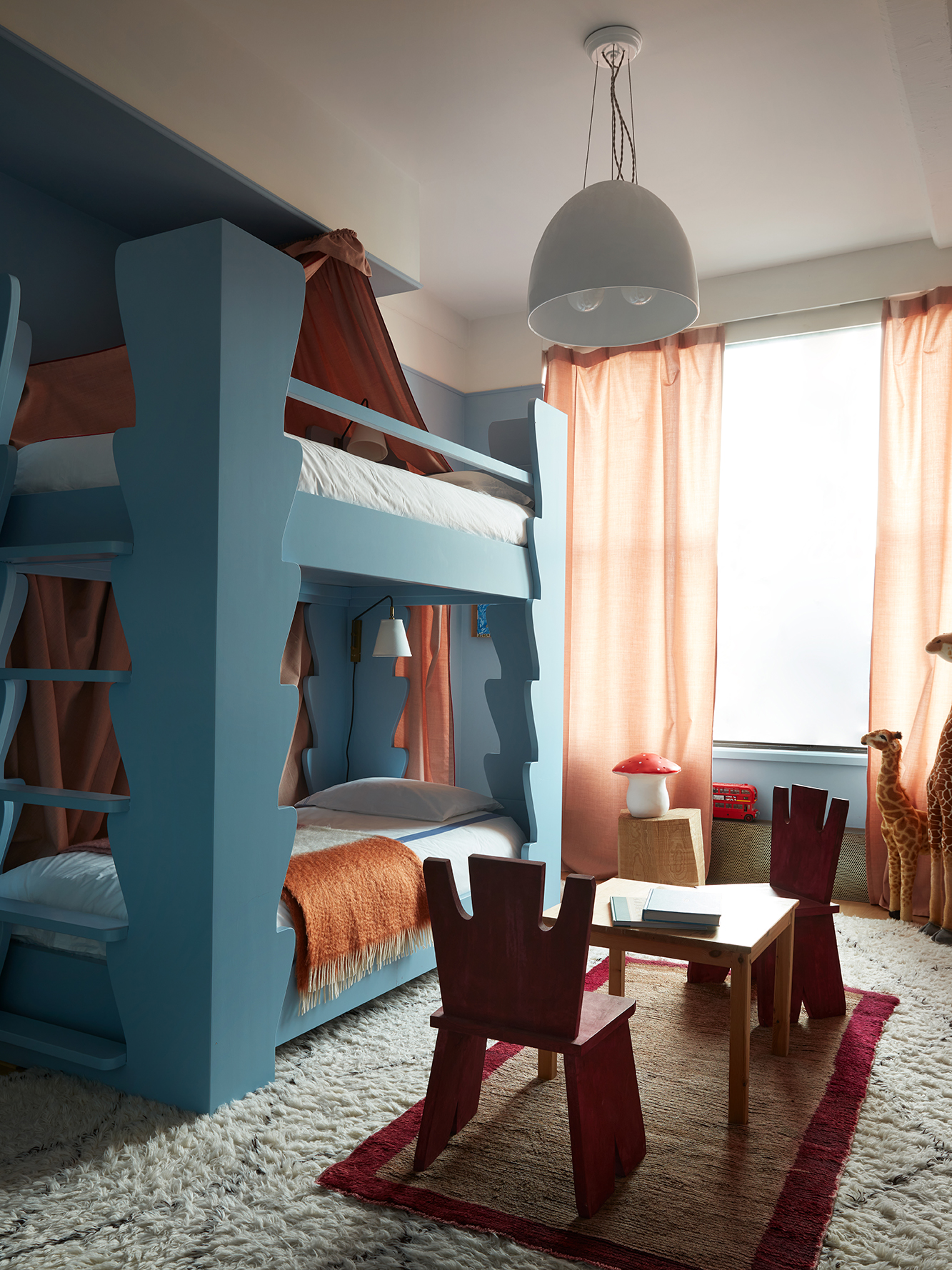 To top it off, they hooked up reading sconces inside the nooks, offering each of their children a little more independence when it’s time for lights out. “Because Paloma is younger, we wanted to give her her own space underneath. And for Roman, he gets to be like the king at the top and have his private little world in the clouds,” says the designer.