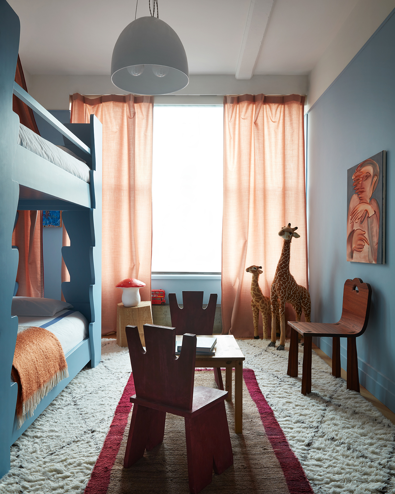 In order to fit both of their kids in the same room comfortably, the pair ditched Roman’s former Donald Judd–inspired daybed for a custom bunk. “We wanted it to be its own environment, like a room within a room,” says Giancarlo. Given the ceilings are so high, he could get away with exaggerating the proportions of the furniture, opting for chunky posts and a wide ladder. Giancarlo’s studio designed the piece so that it would be easy to assemble on-site in less than an hour (the structure breaks down into five pieces, and the ladder components slot right into place). “Everything locks in like a big puzzle, which is what I also liked about it,” he says.