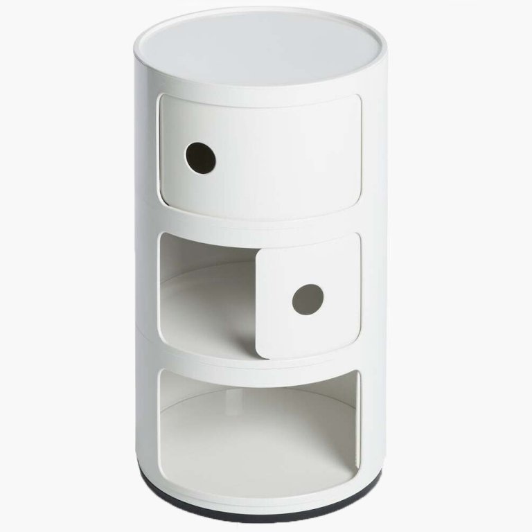Keep clutter hidden in drawers and shelves that double as statement pieces. In an office, a five-drawer cabinet holds onto important papers and supplies. In the bedroom, a circular storage unit with sliding doors can conceal books while also moonlighting as a nightstand.