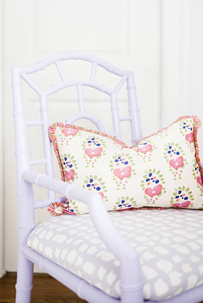 A vintage chair gets a modern update with a fresh coat of lavender paint and a chic reupholstered cushion.