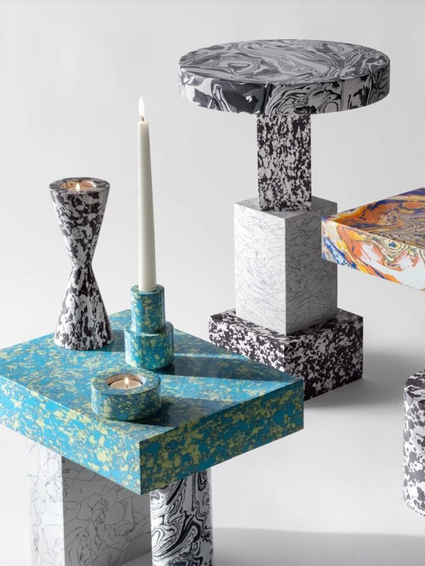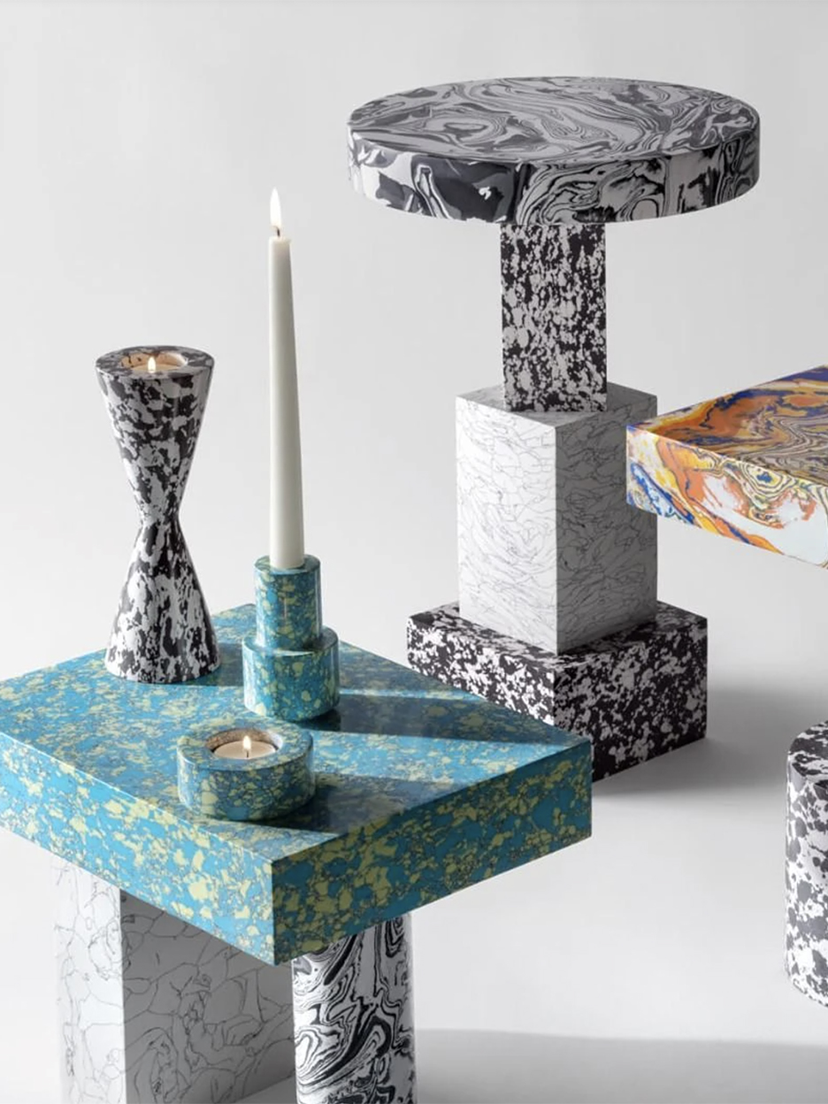This Swirl candleholder by Tim Dixon is made of powdered marble residue in aqua and yellow hues. The cheery colors are reminiscent of the sand and ocean hues of a sunny beach day and will brighten even the darkest and coldest winter nights.