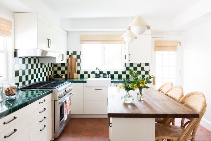 In our last two homes, the kitchen island really brought our family together, so I went big this go-round and parked an extra-large 10-footer and a trio of mismatched barstools in the center of the room so our three kids can pony up to it for quick meals (and keep me company while I cook them). To make the $5,000 unit feel like it wasn’t installed at the same time as the greige cabinets and mid-century lighting, I brushed it with creamy yellow paint (Farrow & Ball’s Hay) and suspended ’30s-style milk glass pendant lights overhead.