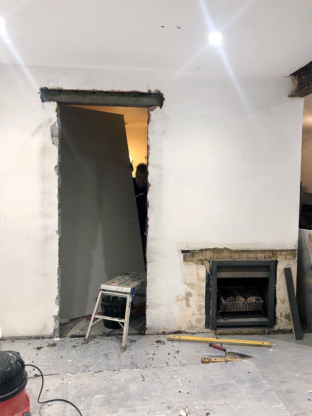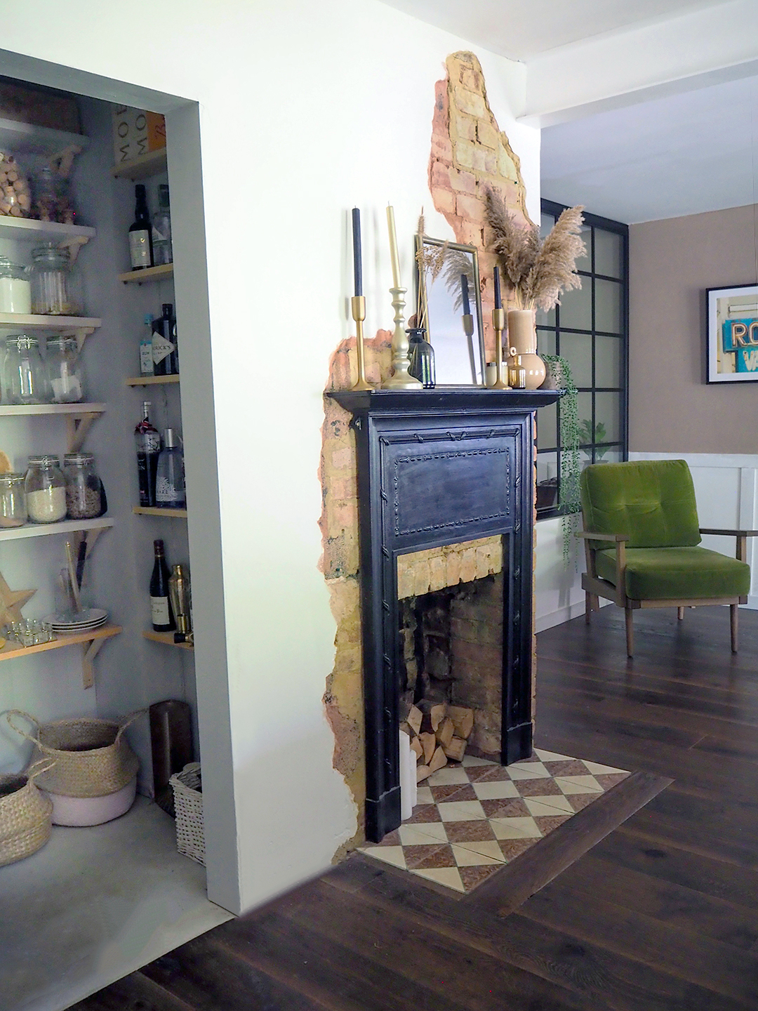 I made room for a pantry and a wider walkway by replacing the bulky (and boring) limestone fireplace with a slim $200 vintage mantel I found on eBay. The real magic is in the crumbling wall surrounding it, though. I plastered over the old fireplace, then just chipped away at sections of the new wall to reveal the original stone beneath. The kitchen feels aged to perfection—after just two months!