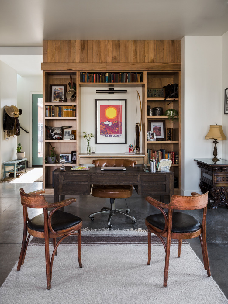 In a similar manner, the built-in shelving unit in the office space downstairs offers a telling picture of the couple. Littered with colorful artifacts, family heirlooms, and other meaningful knick knacks, here, pieces from Rosmann’s past—like the century-old books passed down from her great aunt—and items collected from Pinjuv’s travels abroad peacefully coexist.