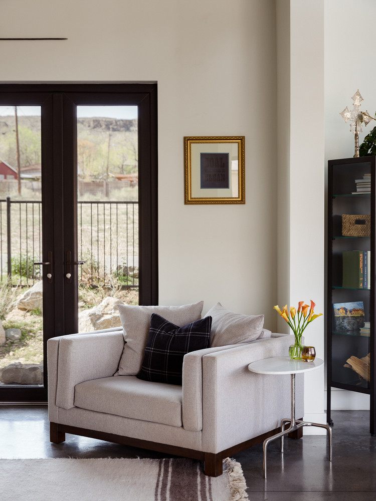 Divided into separate slabs to create a large-scale tile effect, the concrete floor is actually the original foundation that was poured for the home. Not only does the surface’s rugged nature lend a refreshing industrial perspective to the home, but the budget-friendly fix also serves as a natural cooling agent for the 2,800-square-foot desert abode.