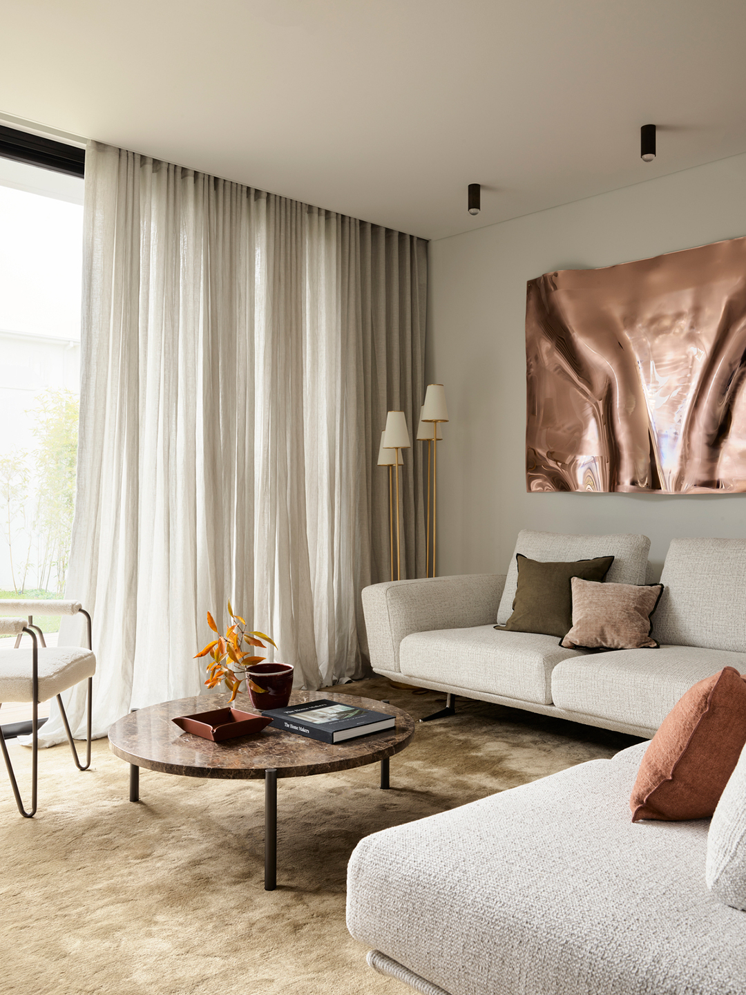 Wanting the living room to feel plush and special but also be able to accommodate numerous guests, the team added a custom marble bench topped with burgundy cushions to either side of the bronze-clad TV unit. For nights when the adults want a little break from the kids, there’s a pair of glass doors nearby with a playroom on the other side that they can shut for privacy (without compromising supervision). Everyone is happier that way: The children have decided they’re not allowed to touch anything in the living room—a self-imposed rule their parents secretly love! “They only use the ‘green front room’ for their toys and playing, ensuring that guests follow the same rules,” says Krimotat, laughing. That’s one way to keep your house looking like it belongs in the pages of a magazine.