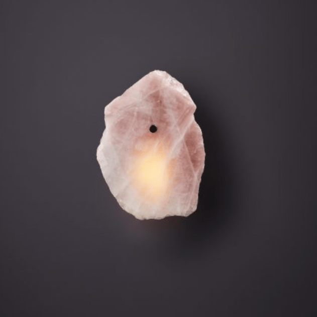 Not wanting the powder room to seem like an afterthought due to its tapered ceiling, McElroy exaggerated the space’s curvature to make it feel intentionally cavernous. For additional impact, the team chose a bold teal Venetian plaster finish for all the walls; Elba marble for the floor; and Verde Antigua marble for the skirting, which mirrors the height of the trim throughout the house. “The mirror was hotly debated,” says McElroy. The sloped ceiling meant it couldn’t be full height, so she honed in on its playful nature with two semicircular pieces that create the illusion of one continuous shape. The pink Petra sconce, also by Christopher Boots, forms the perfect contrast to the all-teal bathroom, casting a truly stunning glow through the natural quartz.