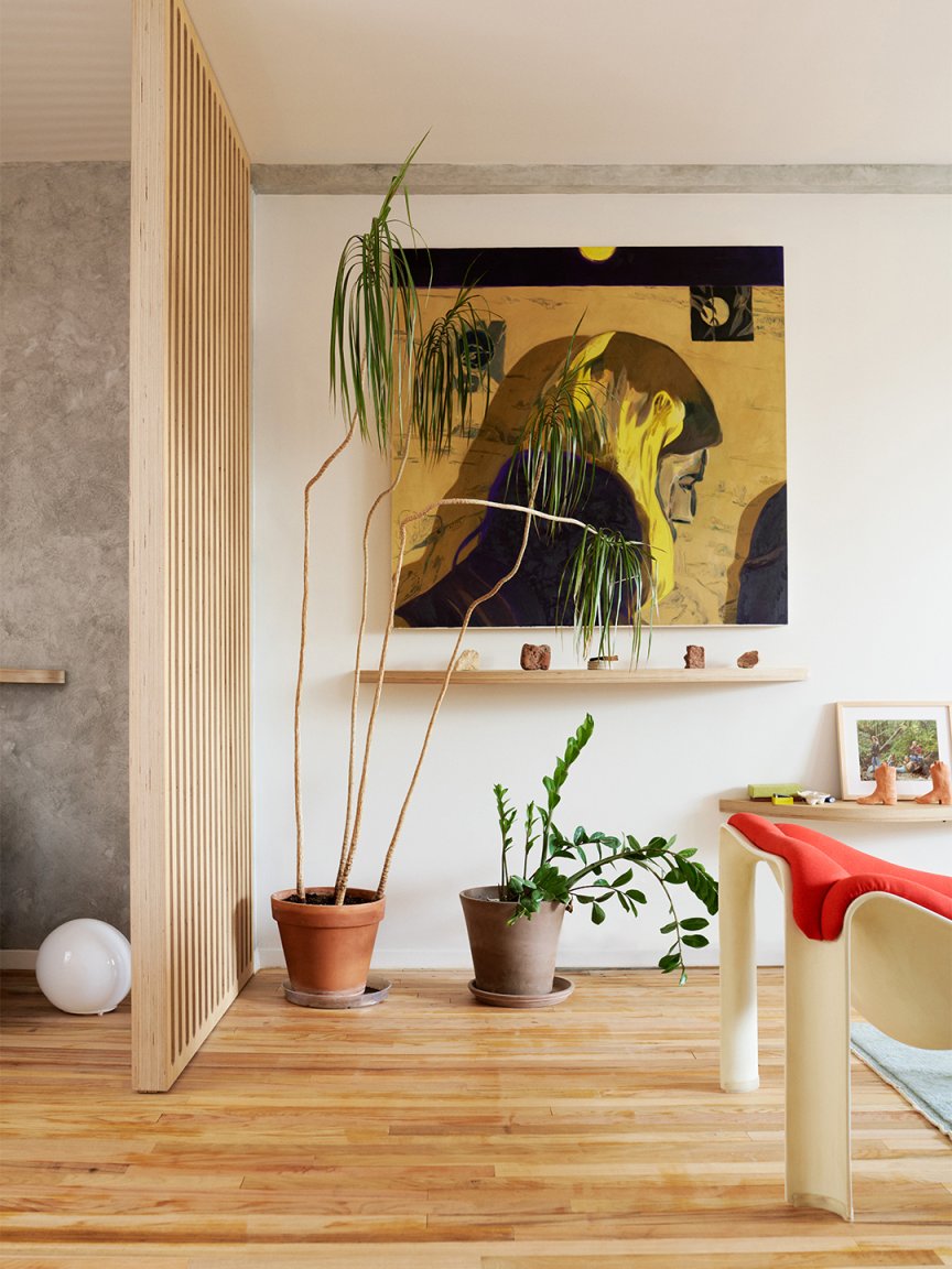 The one thing the couple did know was that they wanted their space to feel like an oasis. Not so much from the city, notes Tompkins (they take pleasure in the crowded streets), but from the once-strict distinction between their work and social lives. Unfortunately, the strange, original layout wasn’t doing them any favors. To separate the extra-large entryway from the living room, Yarinsky proposed a wall divider. But since he’s used to million-dollar budgets, he had to get creative on this scrappier project. “We had to do the most with very little,” he explains. “The screen wall system isn’t even millwork, it’s just fabricated plywood. But it holds the space really well and allows the light through.”