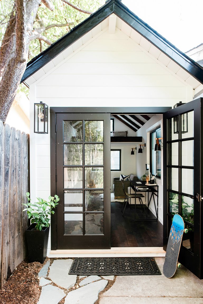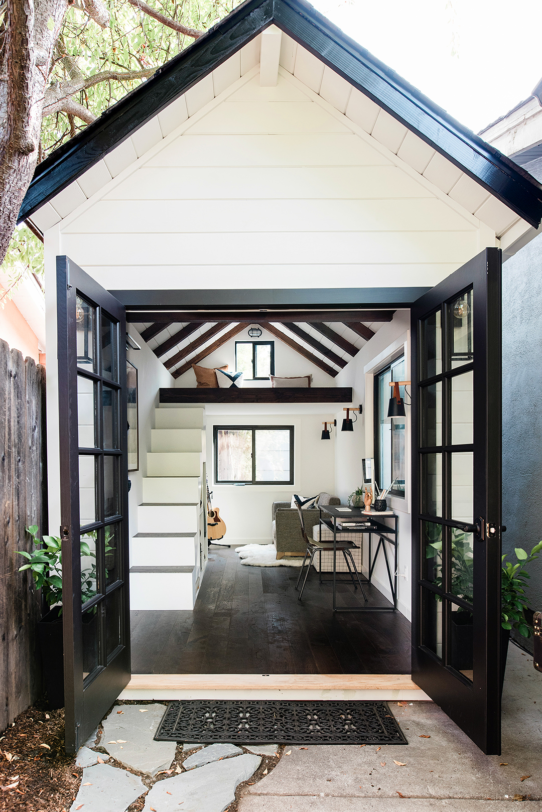 Together, the designer and the contractor planned out the basic layout of the 135-square-foot house, which features a loft bed with seating area below, an office setup, and storage tucked under the stairs. They strategically left room for tweaks as the project progressed, because Furtado was designing based on what she could find in stock. With supply-chain issues and the whole country on a home-improvement kick, she says, “We had to get scrappy.” She opted for off-the-shelf windows from Home Depot, which she painted black. Likewise, the engineered oak flooring was chosen because it was readily available. The French doors were a lucky find on Craigslist.