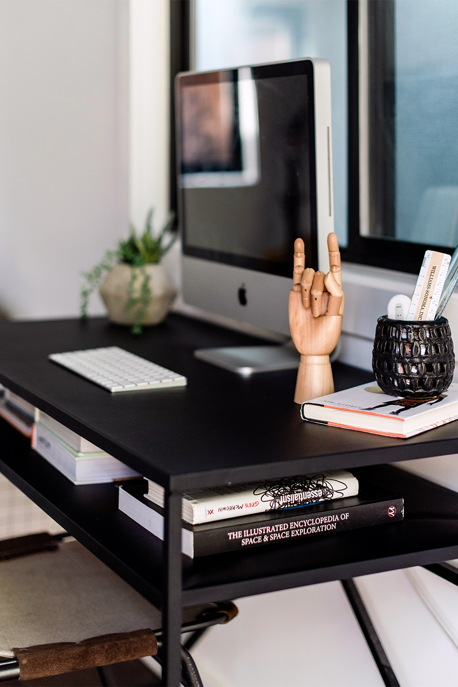 The furnishings, too, had to be carefully chosen based on size and what was available, like the Article love seat, which was ready to ship, and the slim-profile metal desk, a surprise $100 score from Target. Furtado tried to keep costs low but spent a little more on the fixed elements, including lighting from Rejuvenation, Visual Comfort, and Ava Bellucci.