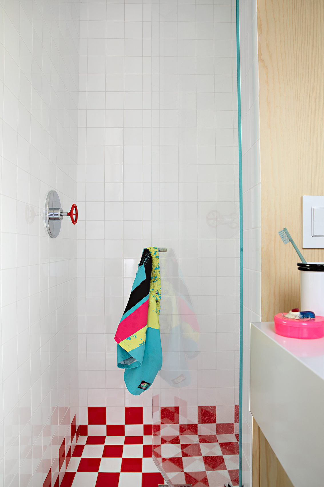 When it came to designing her son’s shower at their Costa Mesa home, Clasen took cues from his shoe closet, which almost exclusively consists of checkered Vans. “It’s a little ode to the slip-ons,” she says of the floor tiles. (Her husband also happens to work for the company.) As a rule of thumb, the designer lets teens’ personal style and interests lead the way. “I also take a hint from the bedroom we’ve designed for them,” she says. Her son’s striped Pendleton bedding brings the graphic touch full circle.