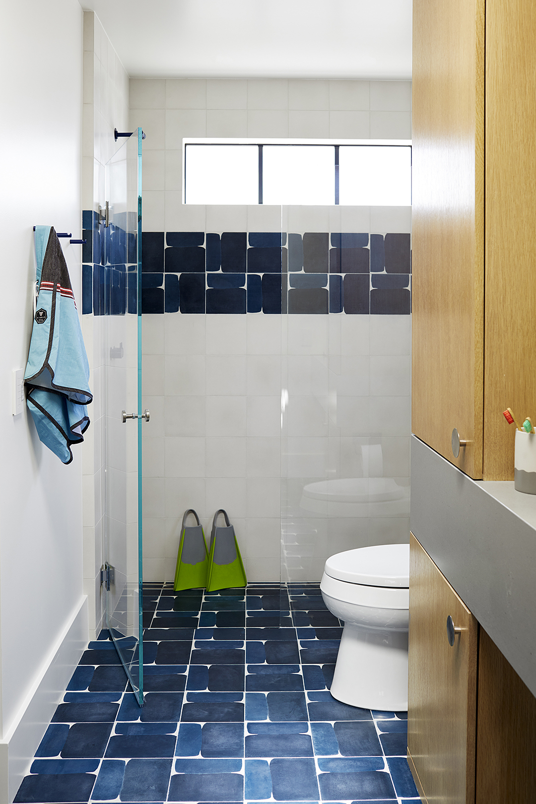 Wood flooring is (almost) always off-limits. “I try to make these spaces pretty indestructible,” says Clasen. Tile and stone surfaces are much more equipped to handle that damp pile of towels sitting in the corner or that half-opened toothpaste tube stuck to the vanity counter. The designer makes the most of the materials she works with by going beyond a simple pop of color. In one space, she took the wavy navy floor tiles a step further by bringing them into the shower—a playful effect that is “less adultlike but still keeps it cool,” she notes.