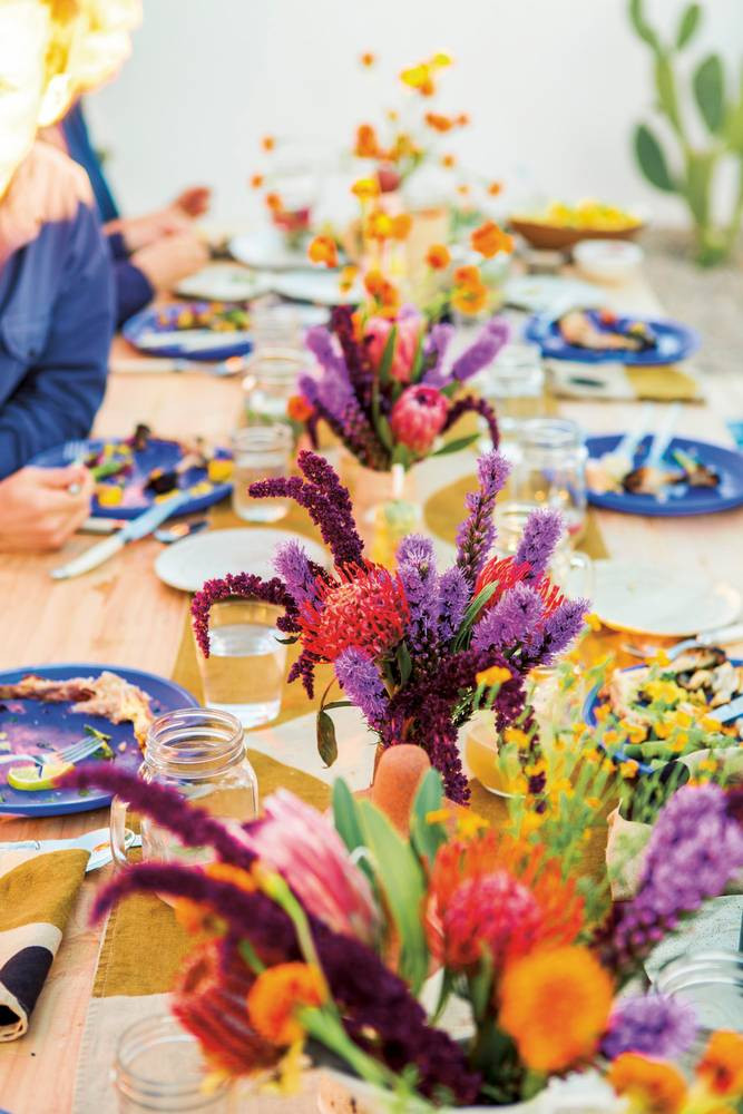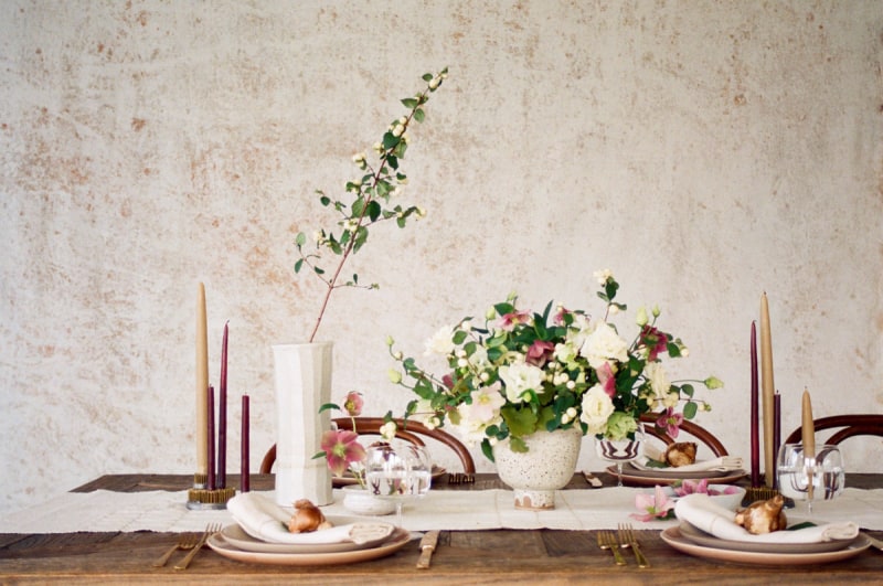 We’re all for utilizing the broad spectrum of hues the season has to offer, obviously, in the form of vibrant florals. Toss all conceptions of typical tonal pairings aside and mix and match to your heart’s content. Intimidated by the idea? Opt for smaller clusters, set in a line down the table, in lieu of the usual grand centerpiece.