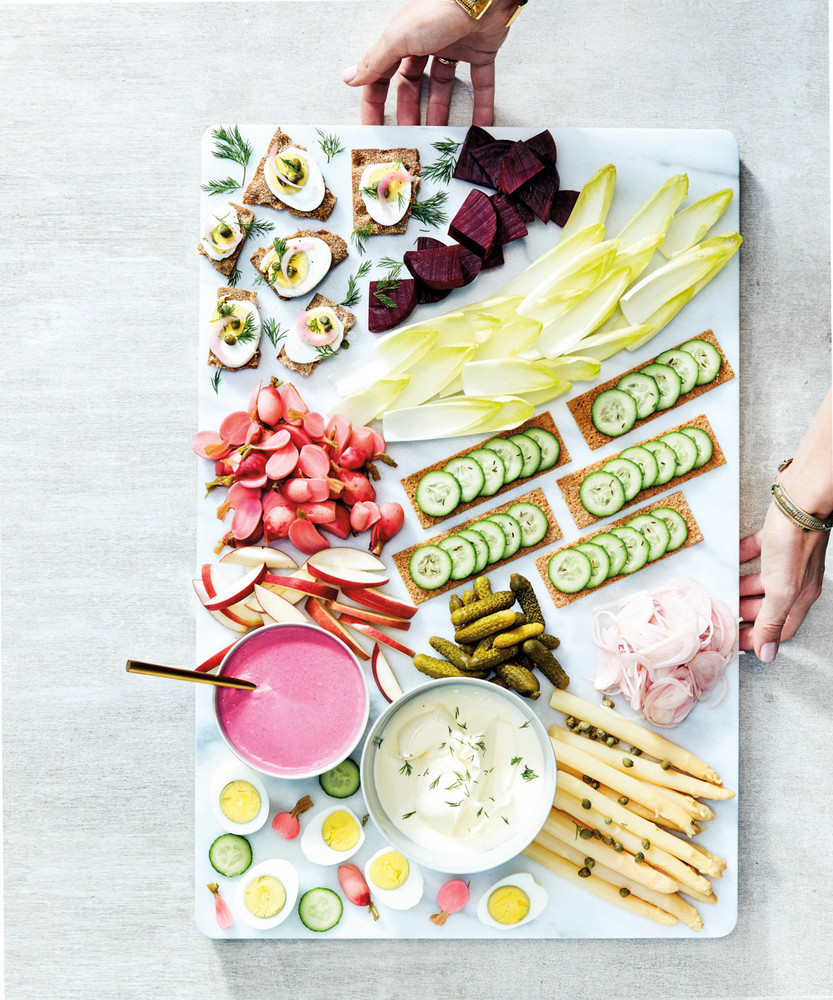 Edible centerpieces are always a good idea, especially with a hungry bunch awaiting dinner. Plus, it takes care of the appetizer round as well. Here, pickled radishes and shallots lend a subtle shade of pink to the table, complementing the Scandi-inspired theme of the board.