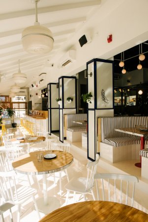 Keep It Cohesive When you enter La Cantine, you truly feel as though you’re stepping into not just a cozy diner but another world. The countertops, menus, silverware, wall decor—they aesthetically sync. Having a say in all aspects of the design experience, from branding to paint colors, was key for Jacobsen. “La Cantine’s logo was designed by Charlotte Delarue, but the rest of the branding was done by me and my boyfriend, Adrian Harwood (we share a graphic design studio, Our Studio),” she explains. “Thinking about cohesiveness in the beginning of the process pays off in the end.”