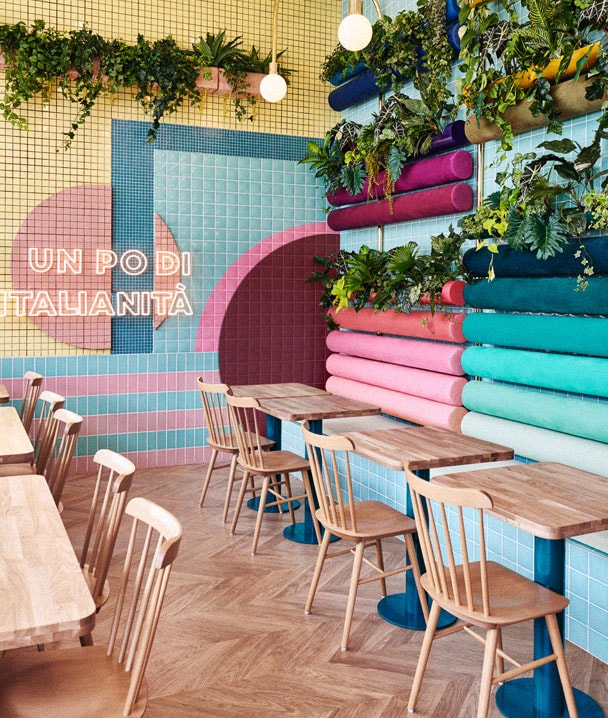 Most people think a view is the most crucial element of a grand outdoor space. But for Goodwin, that wasn’t enough. “You need to frame that view,” he explains. “Because otherwise you’re essentially exposed, and that’s not a comfortable feeling.” A long pergola, a line of white umbrellas, and tall local greenery pull the “ceiling” height down on the rooftop, helping guests to feel like they’re not floating in London’s dreary skies.