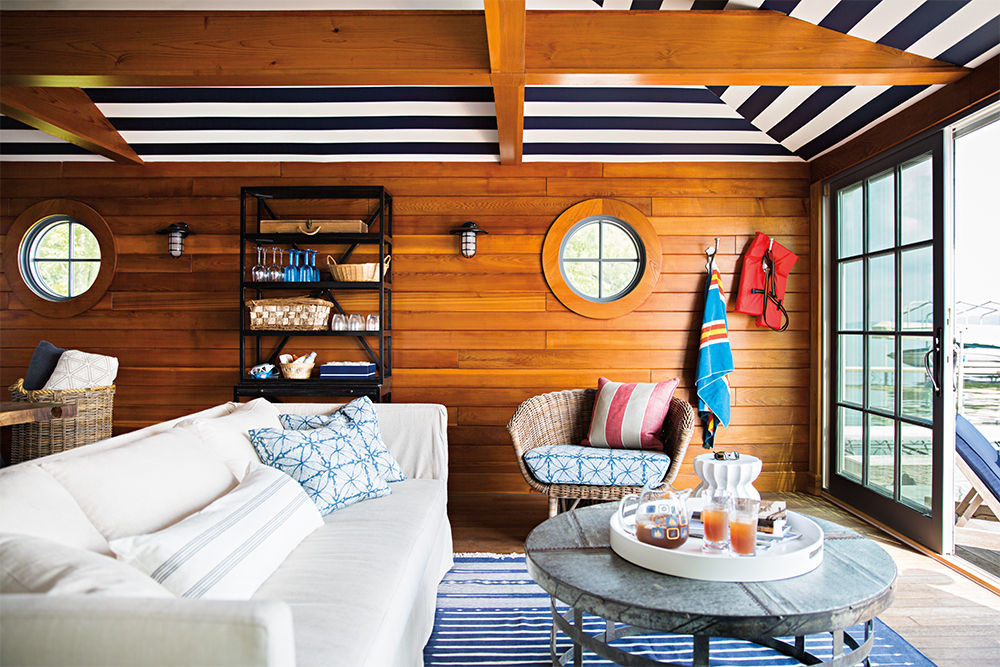 In the backyard boathouse, cantilevered over the lake’s bank, Filicia covered ceilings in a bold striped wallpaper to achieve a maritime atmosphere.