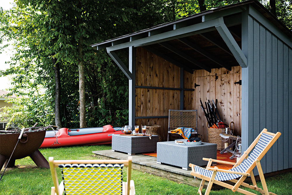 The lakefront lean-to doubles as a storage shelter and a waterside terrace.