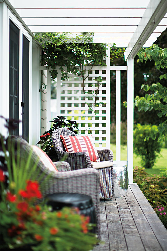 To enhance the home’s dreamy ambience, Filicia crafted a nostalgic decor brimming with nautically inspired charisma. Architectural features such as porthole windows and pine paneling were paired with preppy prints and timeless touches, including plaid bedding and pin-striped wallpaper. “We wanted the house to feel more like a retreat than a full-time residence,” Filicia says, “to embrace the fantasy of a lakeside hideaway, and make it fun.”
