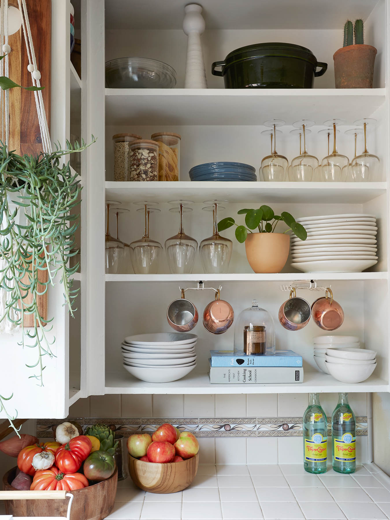 White doorless cabinets help the old-school tile fade into the background in this kitchen, designed by Layne Kula. The tonal palette gives the eye a visual breather, guiding you to take in the homeowner’s tableware collection—or the view of the backyard—instead. See? What’s old can be made new again.