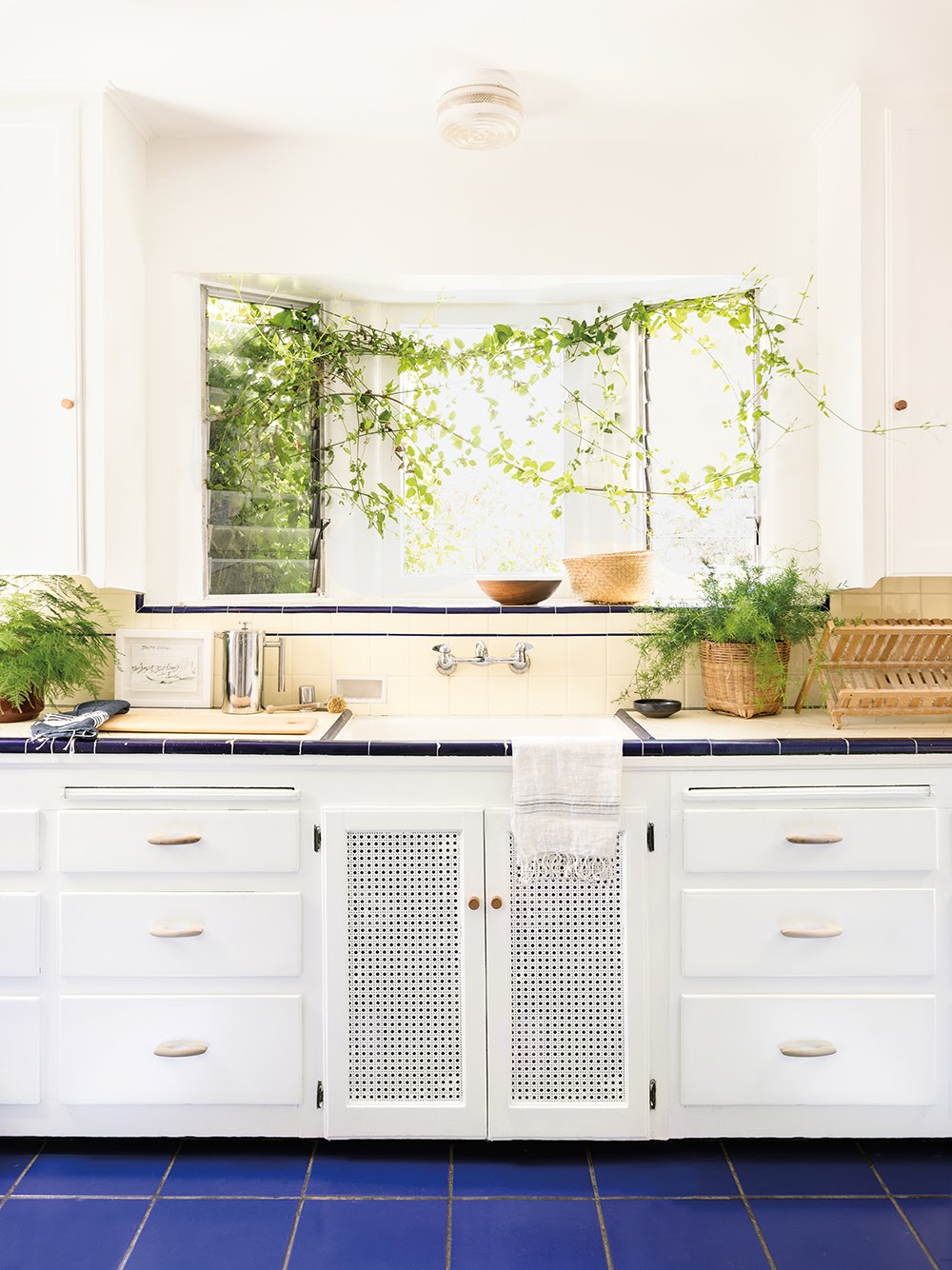 Most ceramic tiles can be painted as long as they’re not subject to water. According to Sherwin-Williams, you’ll have to clean and lightly sand the surface first (as you would a wall) and go over it with an acrylic primer before applying a high-quality latex-based paint. You don’t have to go overboard. The cobalt blue edging in Jesse Kamm’s Los Angeles kitchen is all that’s needed to make the surface seem intentional.