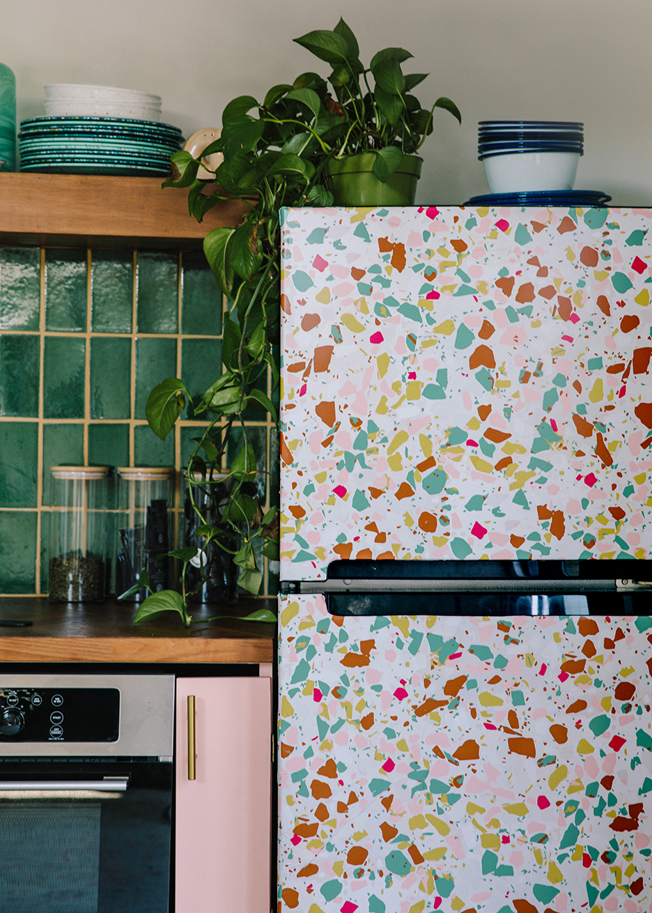 The boring refrigerator also got a facelift—not with paint, but with terrazzo-pattern contact paper. It took all of 30 minutes for Blackett to apply the stick-on sheets to the facade of the appliance. For any of the air bubbles that she couldn’t smooth out with a credit card, she poked holes in them with the end of a safety pin. “If I get bored of it, I can just peel it off,” she says.