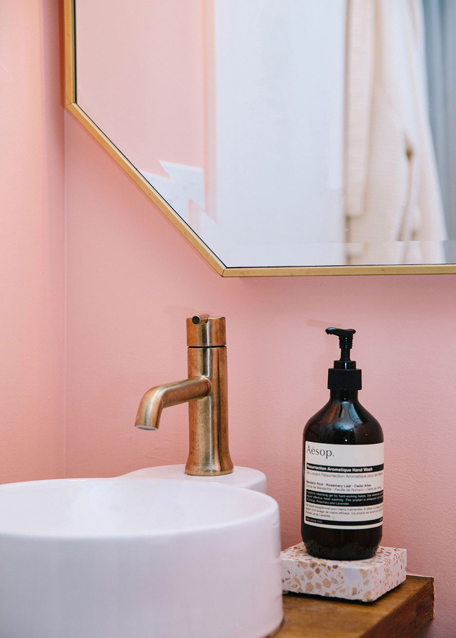 Because this isn’t a high-traffic area, Blackett didn’t want to invest thousands of dollars in custom cabinets. “They just had to work,” she says. So she chose budget IKEA cupboards instead (though you’d never know it with that bespoke paint color, which Blackett also used on the walls of the bathroom). The countertop, sink, and faucet are also from the Swedish retailer.