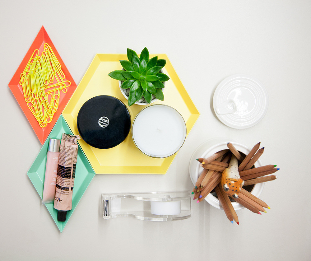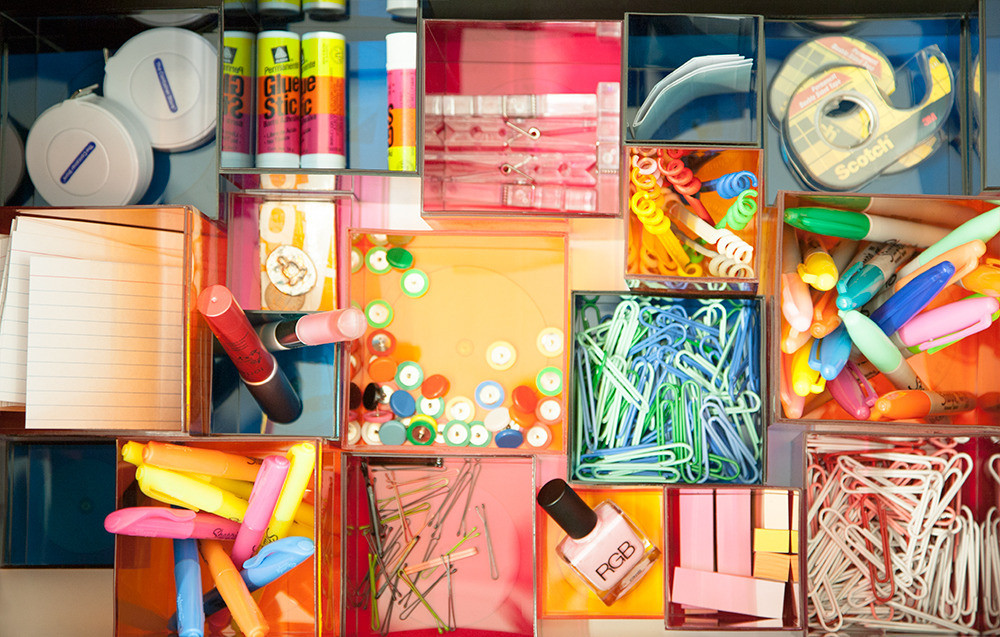 Find room in a drawer for your stapler, tape dispenser, post-its, highlighter, and other useful but ugly supplies.