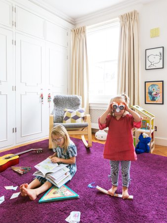 McKim had initially planned on doing a wood and rope ladder, but after seeing plumbing pipe at Home Depot, she decided on a whim that it felt more train-themed. For the seat cushion and pillows, she repurposed West Elm curtains she had purchased for her daughter’s room (but never used). With $2 leftover denim fabric she had bought for reupholstering a vintage sofa, she built a few book slings. “I originally had ledges there, but it quickly became apparent that the books needed to be more secure when both kids were bouncing around,” she explains. To finish off the space, McKim hung a vintage map—the first thing she had bought after finding out she was pregnant with her son. “It’s a regular thrifted find, but it feels so sentimental to me,” she says. “He doesn’t know it yet, but it will one day hang in his first apartment.” (Spoken like a true mom.)