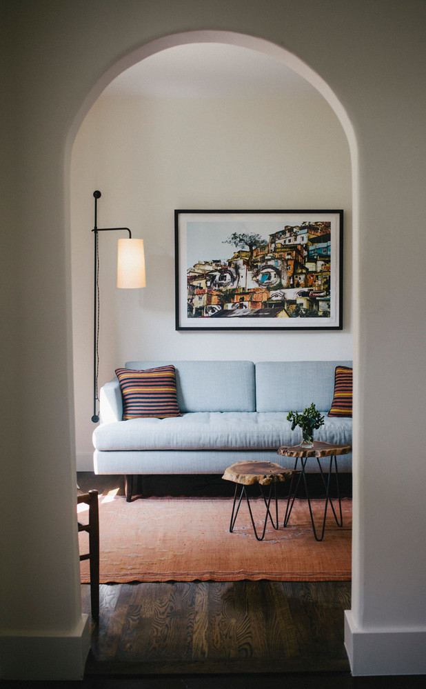 Since she needed some exceptional home design elements, Brockman called in her “design soul sister”—Homepolish designer Michelle Zacks—to add some accents to the whitewashed space. “She knew exactly the vibe I wanted, and just how to pinpoint pieces worth investing in, versus saving on,” says Brockman, who cites midcentury modern influences, plants, rattan furniture, and vintage carpets as inspirations. “I wanted my apartment to feel like Laurel Canyon-meets-Tribeca, but not too bohemian,” the entrepreneur explains. “Rustic, cozy, and modern.”