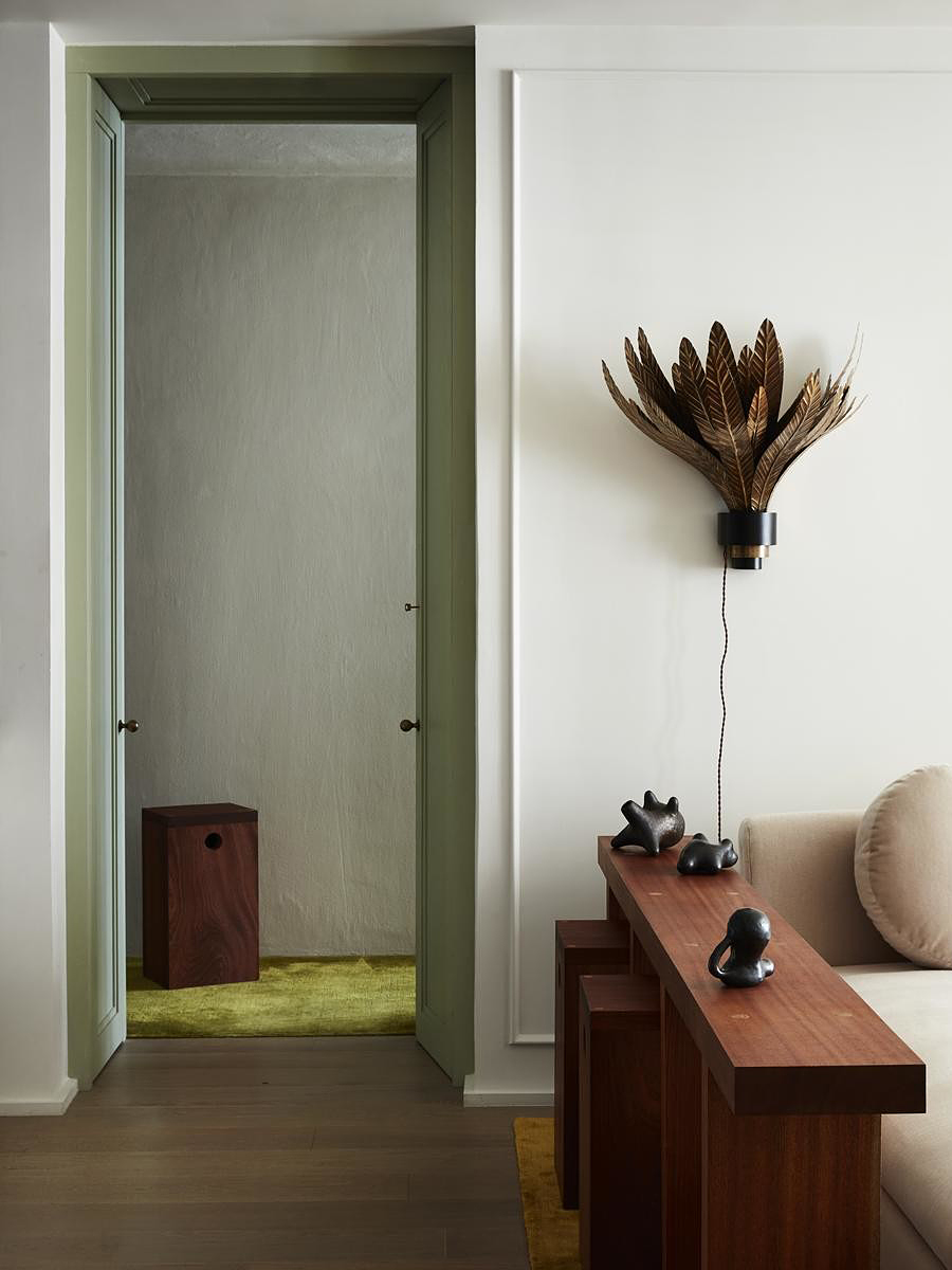 Architect Giancarlo Valle used a subtle shade of sage green in a recent project to draw the eye into the next room—and away from the fact that you’re crossing through a mini hallway of closets.