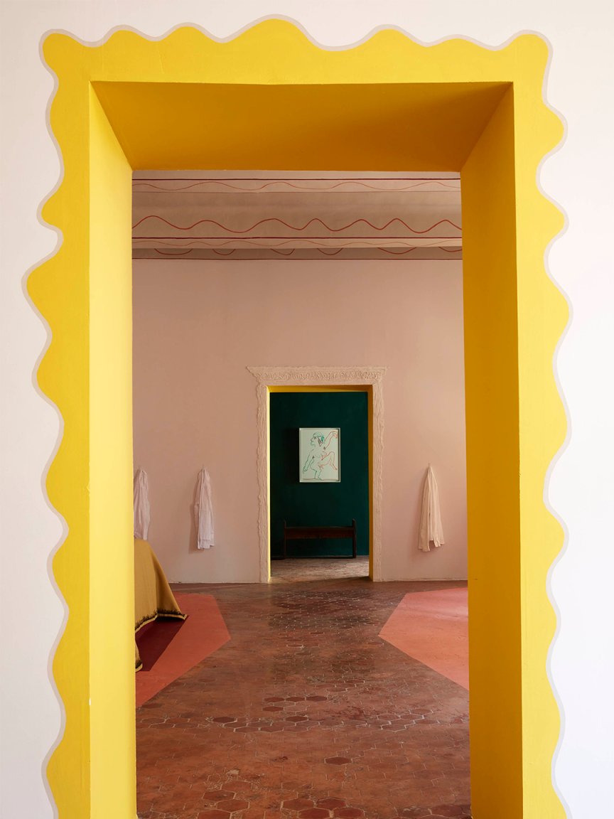 No moldings? No problem. Interior architect Pierre Yovanovitch found the perfect solution: framing a doorway in free-form yellow waves that create a kind of trompe l’oeil effect, not to mention visual interest. It’s an ideal project for a white-box apartment in need of some sunshine.