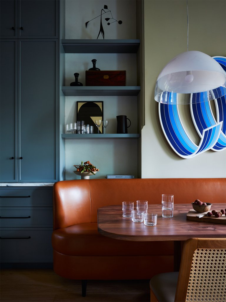 We don’t often think of blue as a neutral, but a darker tone that skews almost black, such as Benjamin Moore’s Blue Note (pictured above), checks that box. Steer clear of nautical vibes by peppering vintage rugs throughout and embracing farmhouse features, like a trough sink. Move over, monochrome, two can play that game!