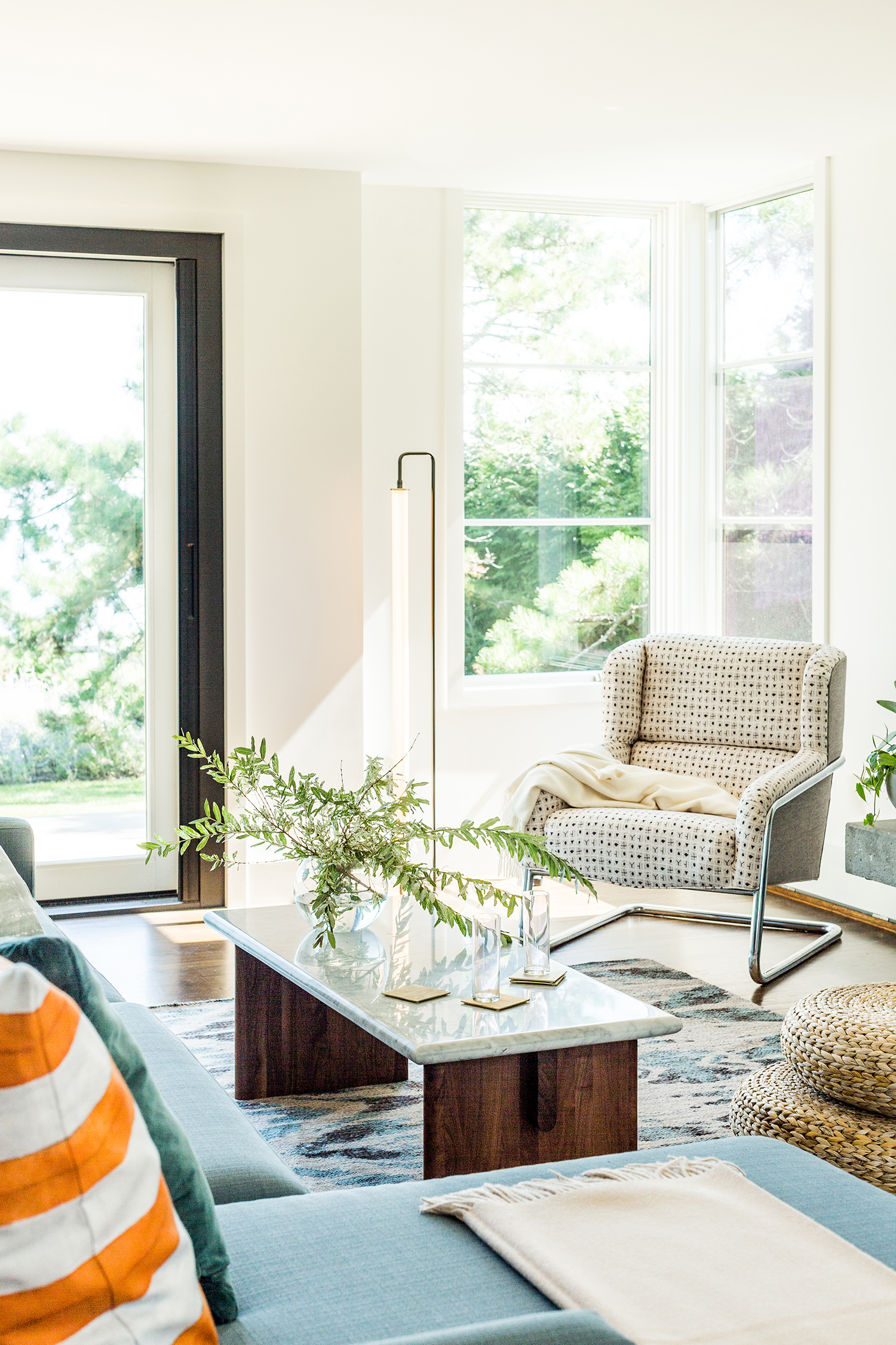 While classic in silhouette, the marble and wood coffee table from Rejuvenation serves as an airy anchor for the rest of the elements in the room, including the retro corner chair Karu sourced from 1stdibs and swathed in a printed cotton textile by Rouse Phillips.