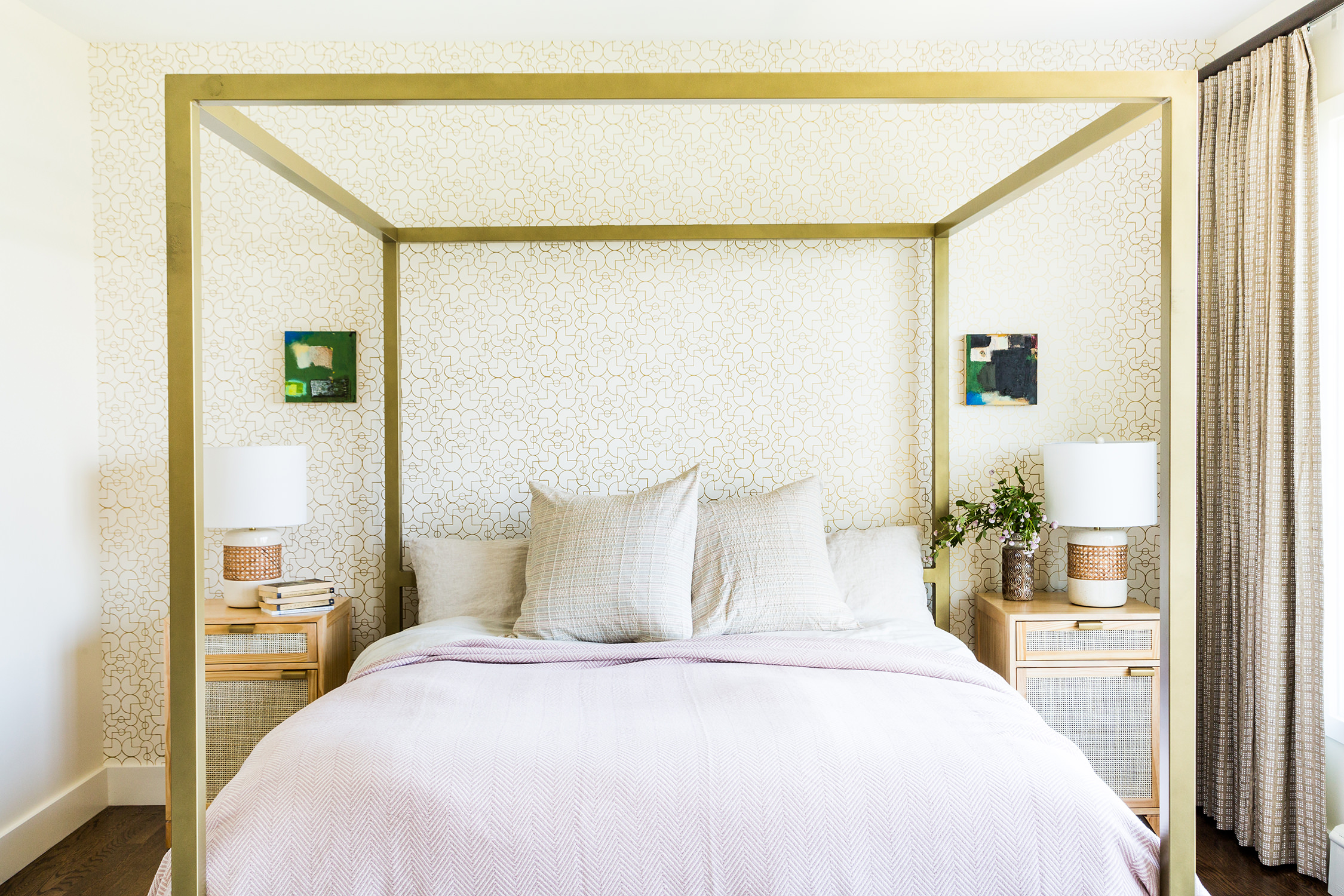 In the master bedroom, Karu substituted bold upholstery for a refreshing dose of wallpaper. In lieu of masking the space in a dark gray or deep navy paint, the designer kept with the home’s warm aesthetic with an elevated treatment from Hygge and West in gold and cream.