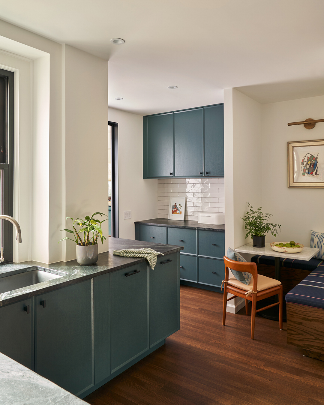 While the kitchen’s zigzag-like layout isn’t all that conducive to entertaining, Beryl didn’t mind it that way. “Opening up the kitchen would have been a departure from that old-world, classic Upper East Side apartment style,” she explains. Still, the designer wanted to make it a place where the couple’s toddler could hang out while dinner is in the works, so she reserved one corner for a tiny breakfast nook. The long bench is finished with thick-weave Maharam fabric, so it’s extra-durable.