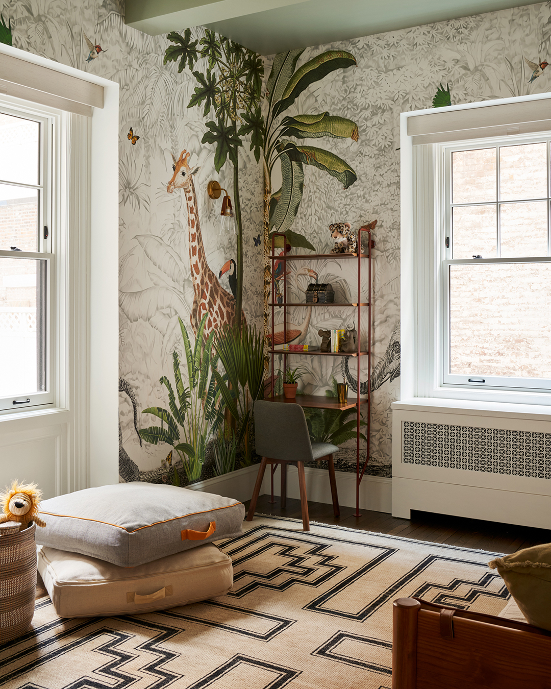 There’s no mistaking that a kid lives in the second bedroom, though. Beryl chose a jungle-themed wallpaper from Etsy and used it on all the walls to really transport the little one to the depths of the Amazon. The powder room presents another full-force pattern moment. Because the space is connected to a small Peloton area, Beryl kept the sports theme going with a swimmer-inspired print.