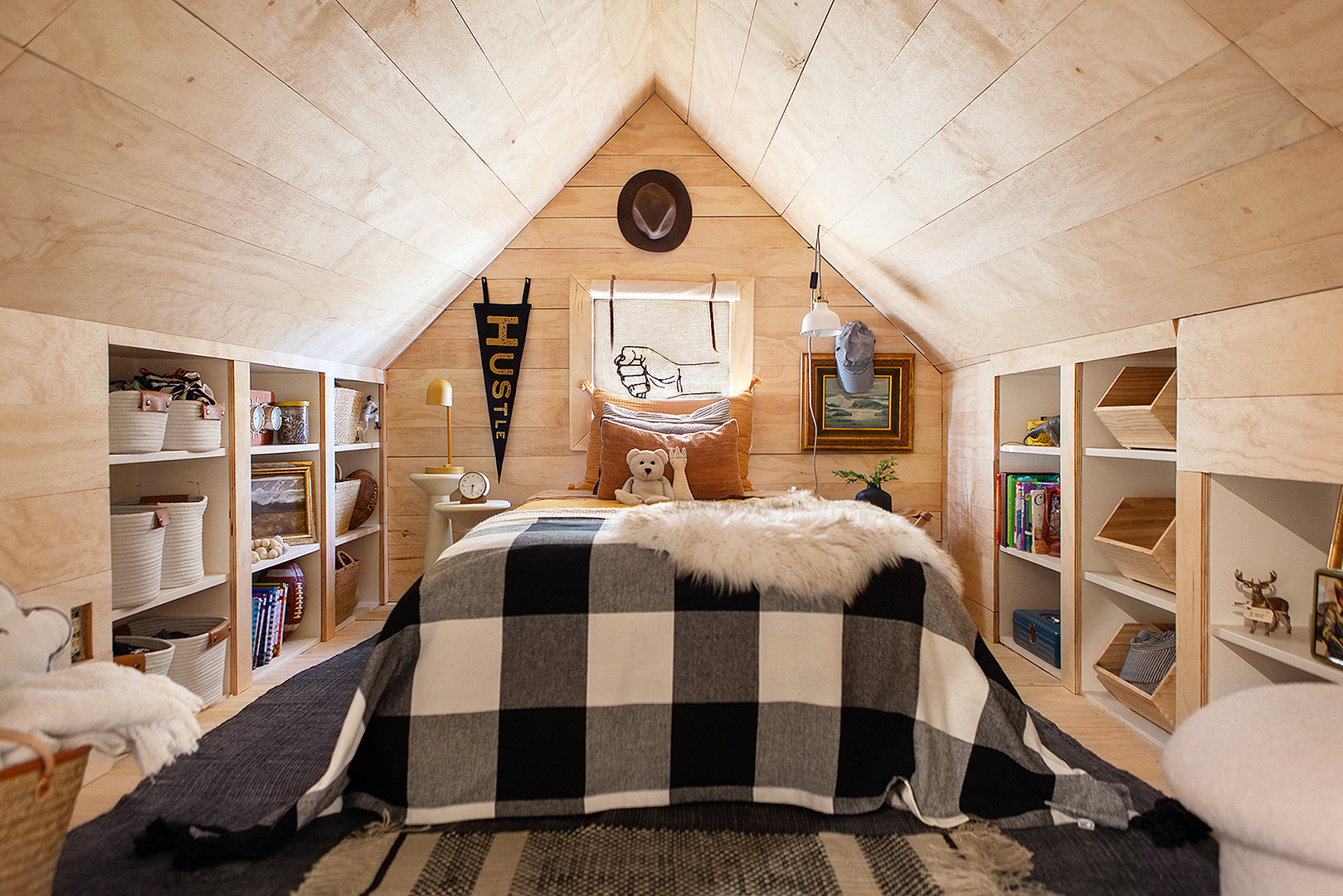As veteran DIYers, the Curtises knew they could tackle the project on their own without professional help. First, they paneled the whole alcove in wide planks of maple they cut themselves. Then Ginger tapped Asher’s 8-year-old interests for decor inspiration—weaving his love for both dinosaurs and Indiana Jones (hello, safari tent curtains!) into the room. Here’s how she transformed the former storage space.