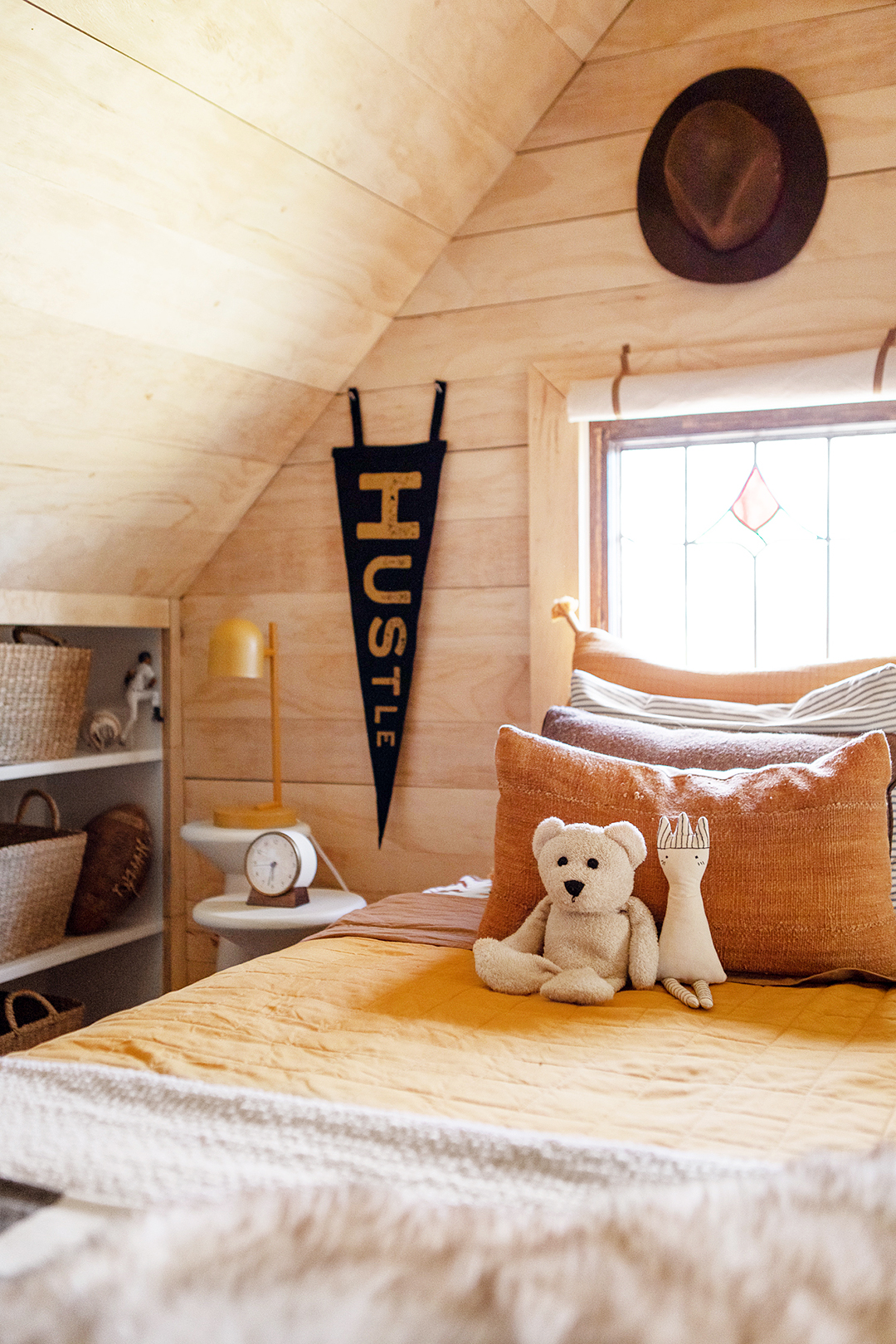 If your child has a hankering for a themed bedroom, Ginger suggests catering to their interests with something one of a kind. In Asher’s room, she nodded to her son’s obsession with Indiana Jones by hanging her grandfather’s hat (a dead ringer for Indy’s) on the wall and displaying an antique three-face clock on the shelf. Likewise, she recommends scouring eBay and Etsy for vintage wall art: A throwback Batman poster will satisfy your kid’s wants and still vibe with grown-up decor sensibilities.