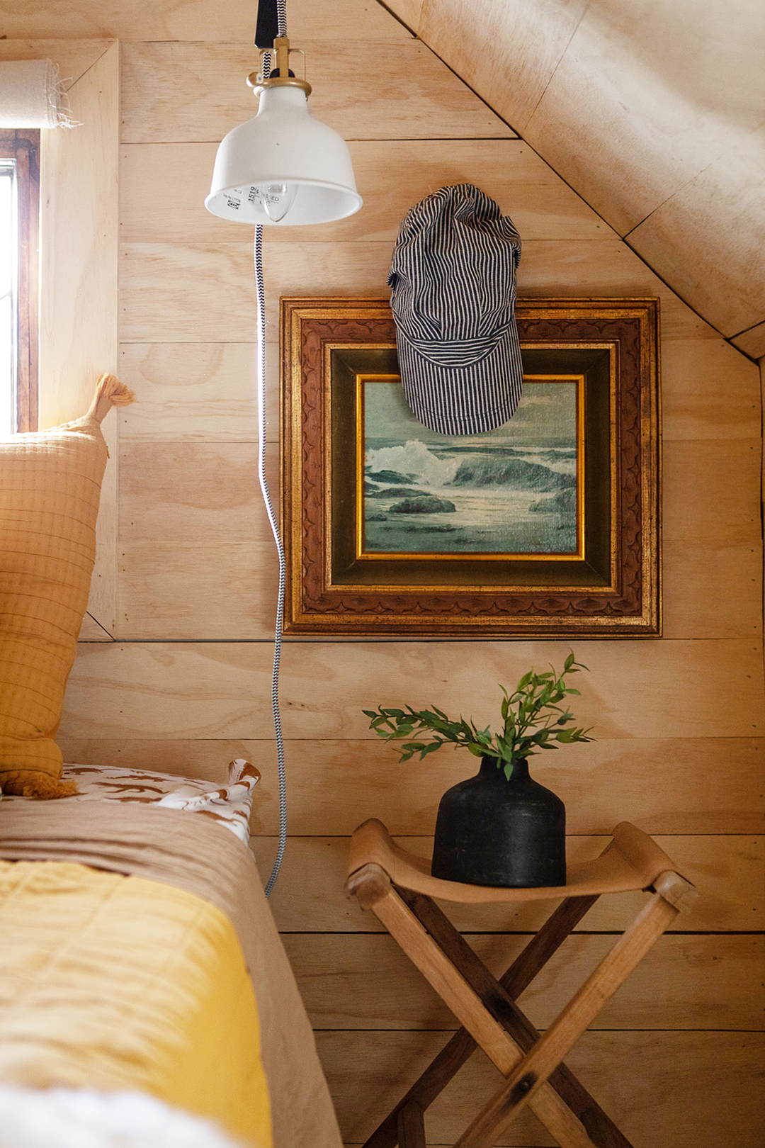 One of the first things on Ginger’s renovation punch list: the unsightly can lights, which were an impractical choice for the low ceilings. “They were so ugly,” she says. To avoid the cost of hardwiring sconces, she opted for a cozy plug-in table lamp and hung an IKEA clip light from a hook next to the bed.