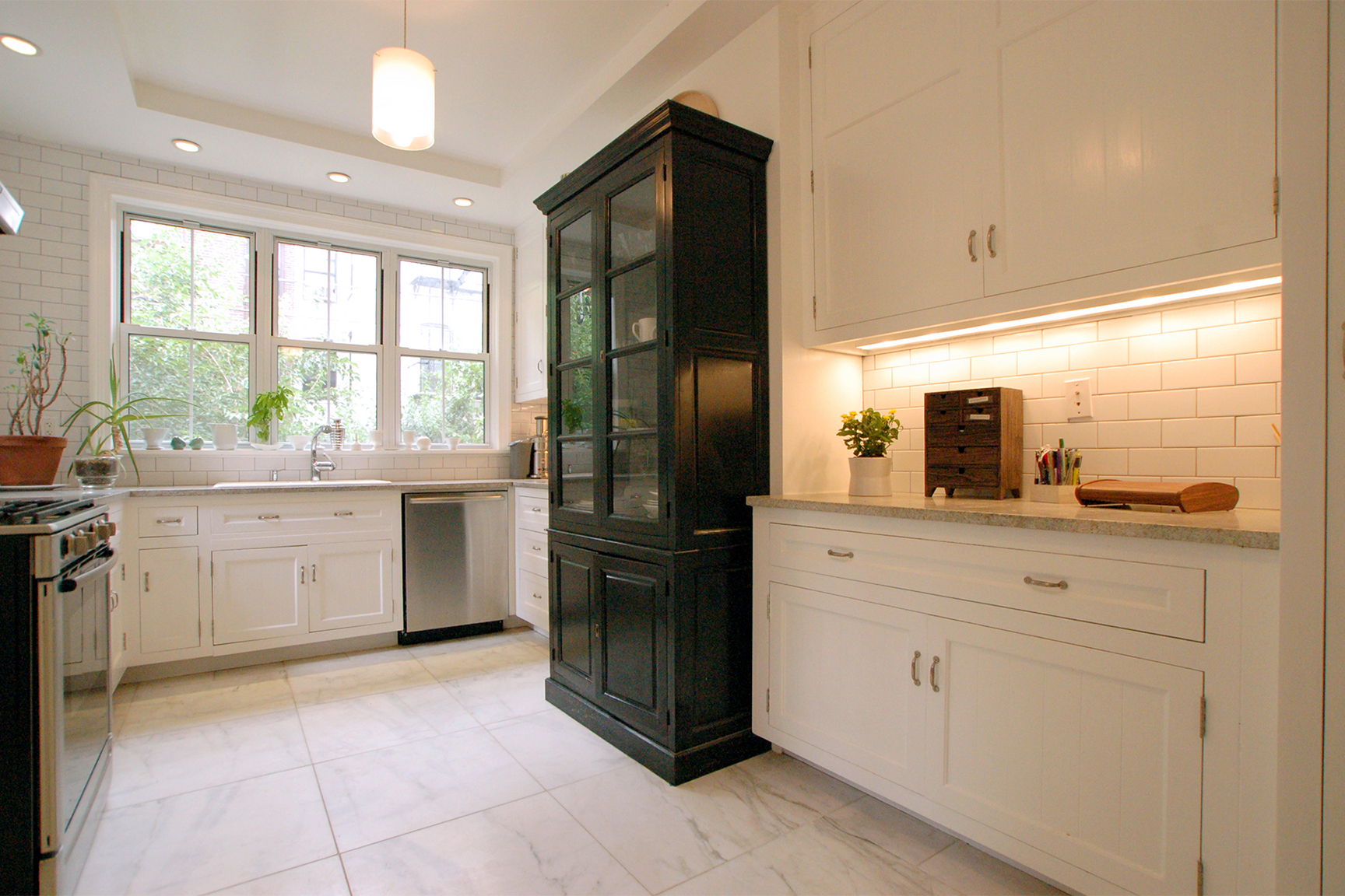 To meld her new (old) cabinetry with the bones of her historic brownstone, Brownhill had her contractor recut the granite and trim down one unit, then they repainted all the Shaker fronts a classic creamy white. The two cupboards they couldn’t squeeze in now live in her dining room.