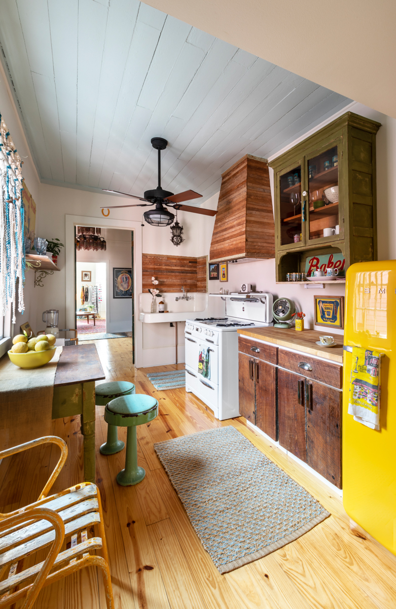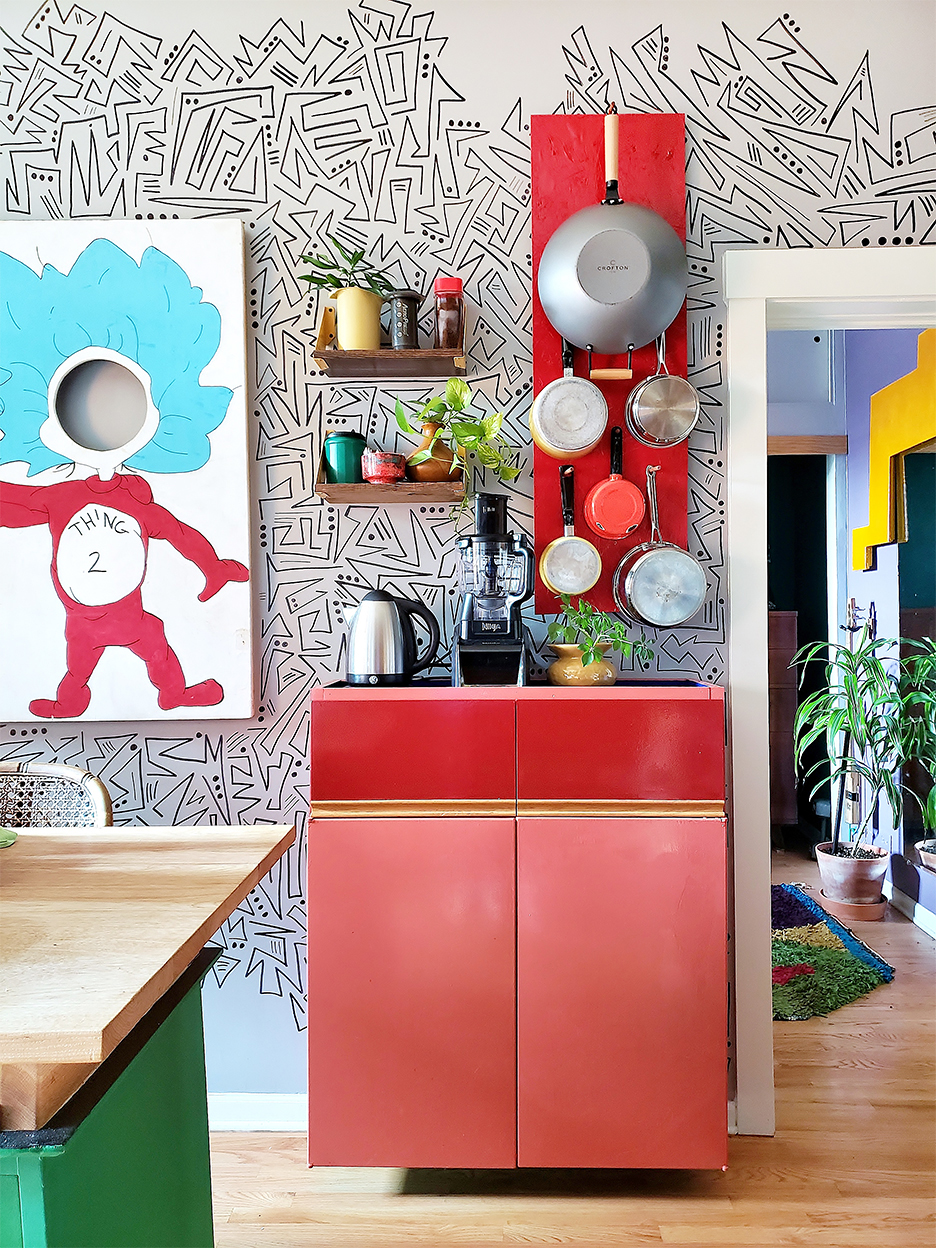 Shannon went the opposite direction in her home’s coffee nook, coating salvaged retro melamine storage in a bright cherry red that ties in with the pot rack above it. If you’re also the proud owner of the ubiquitous ’80s style, she recommends skipping the prep work altogether in favor of slapping the paint right on—it absorbs well from the get-go.