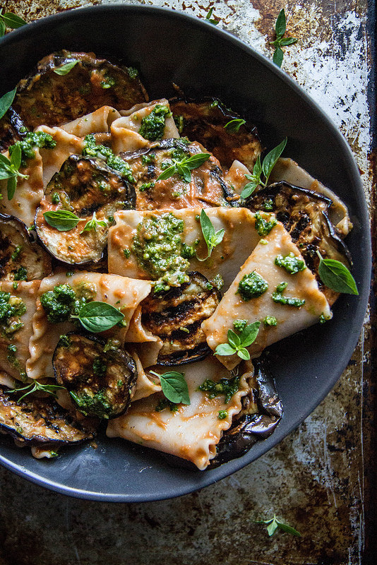 Pasta with Grilled Eggplant and Basil Walnut Pistou