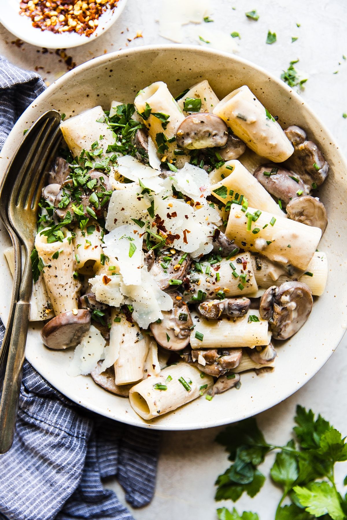 Cremini mushrooms, egg noodles, and almond milk comprise this vegan-friendly vegetarian pasta recipe from Evergreen Kitchen that’s simple yet indulgent.