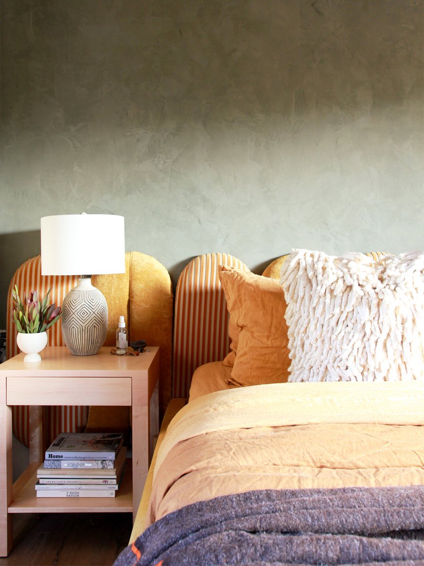The Art Deco–inspired design was not without its challenges. For one, the fabric showed up the day before they had planned to reveal the space. (“Let’s just say it was a long night,” says Carrier.) The project is surprisingly easy—as long as you have the right tools. “If you’re using a hand stapler, your wrists will not thank you later,” cautions Mutter-Rottmayer, who suggests splurging on an electric carving knife instead of a box cutter. Here’s everything they did to get their bed frame just right.