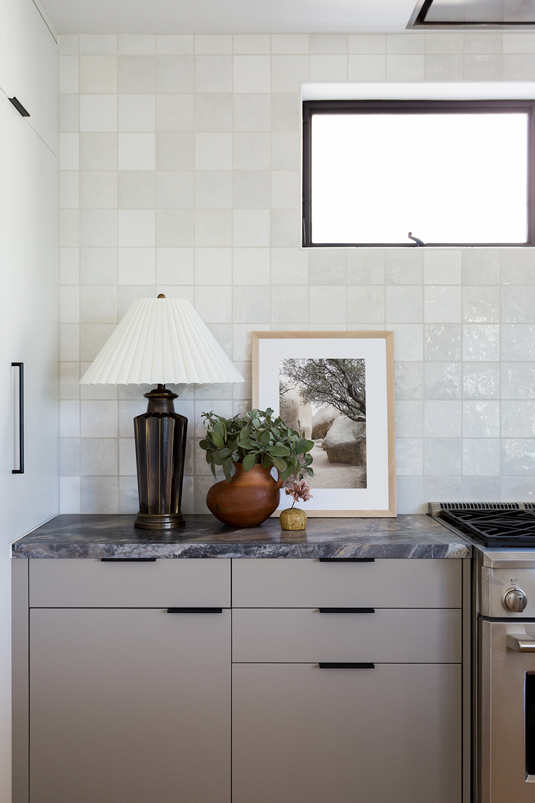 Downlights without dimmers lack in the ambience department; Stein likens their effect to an office or cafeteria. “To me, lighting is everything,” she says. By hiding her client’s blender and toaster in a quasi-appliance garage and freeing up counter space, she could incorporate a large table lamp—her go-to finishing touch, not to mention essential for the crucial transition from meal prep to cocktail hour.