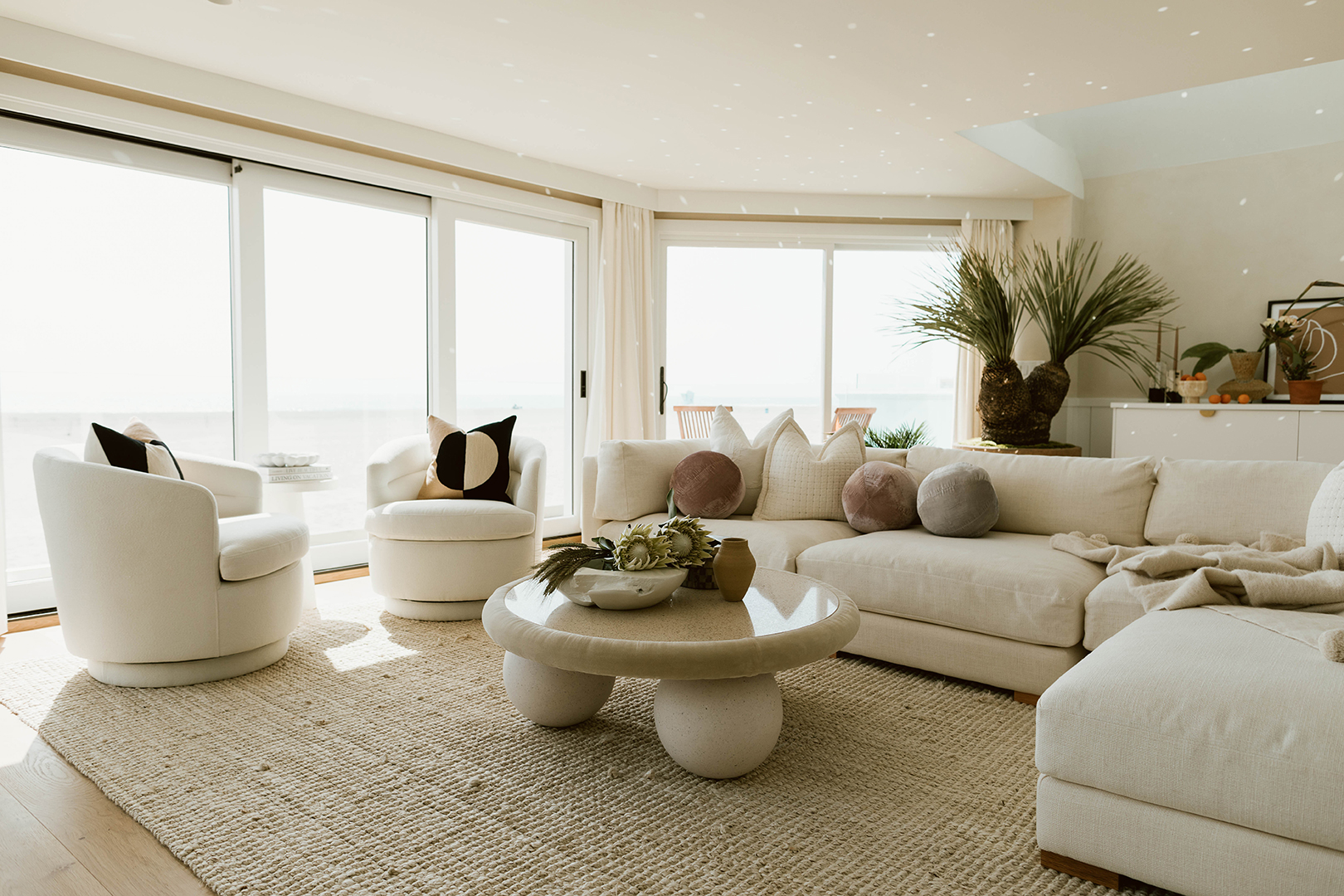Much like the Pacific Coast Highway (which you’d have to drive along to get to this Ventura, California, property), the beachside home’s interior is full of unexpected curves and turns. After a Los Angeles–based couple with two young kids bought it as a place to escape during the onset of the pandemic (it was the last oceanfront house available at the time), they brought in designer Jess Diab, former project manager to Sarah Sherman Samuel, to jazz up the space. “They were in bunker mode; they needed everything in this house,” recalls Diab. Inspired by the swooping entry stairwell, she committed to the circa-1980 home’s irregular shapes and compartmentalized social areas. “We wanted to celebrate the space’s geometry,” she says.